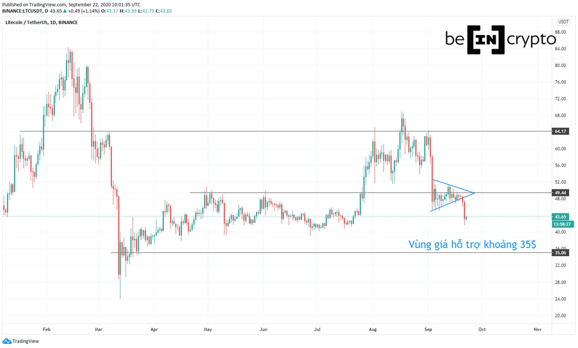 Cách đây vài ngày, LTC vẫn đang biến động trong mô hình tam giác cân. Nếu phá vỡ tam giác cân này, biến động giá Litecoin thông thường sẽ sụt giảm thêm một đoạn nữa, đồng thời tương đương với biên độ của cơn sụt giảm trước.