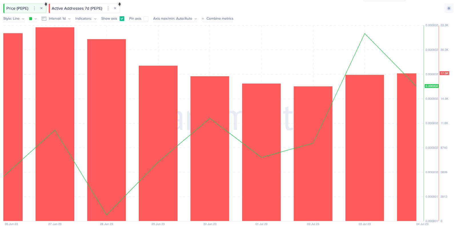 Từ ngày 28/6 – 4/7, giá PEPE tăng 16%, nhưng lượng địa chỉ ví hoạt động trong ngày (Daily Active Addresses) của PEPE đã giảm 24%.