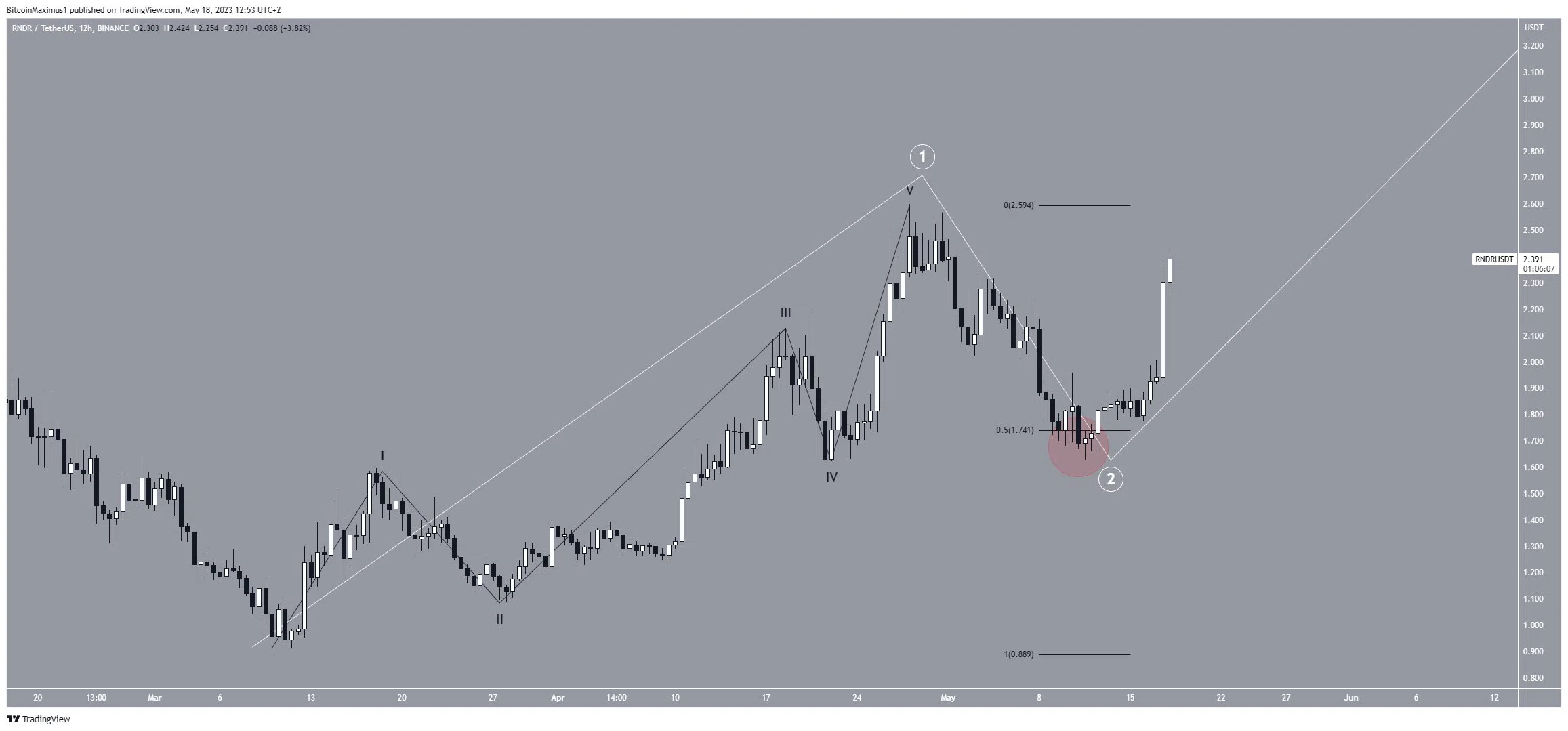 Kể từ đầu tháng 3, RNDR đã hoàn thành chuyển động đi lên gồm 5 sóng (màu đen). Sau đó, đợt giảm tiếp theo kết thúc ở mức hỗ trợ thoái lui Fibonacci 0.5 và trong lãnh thổ của sóng bốn (vòng tròn màu đỏ).