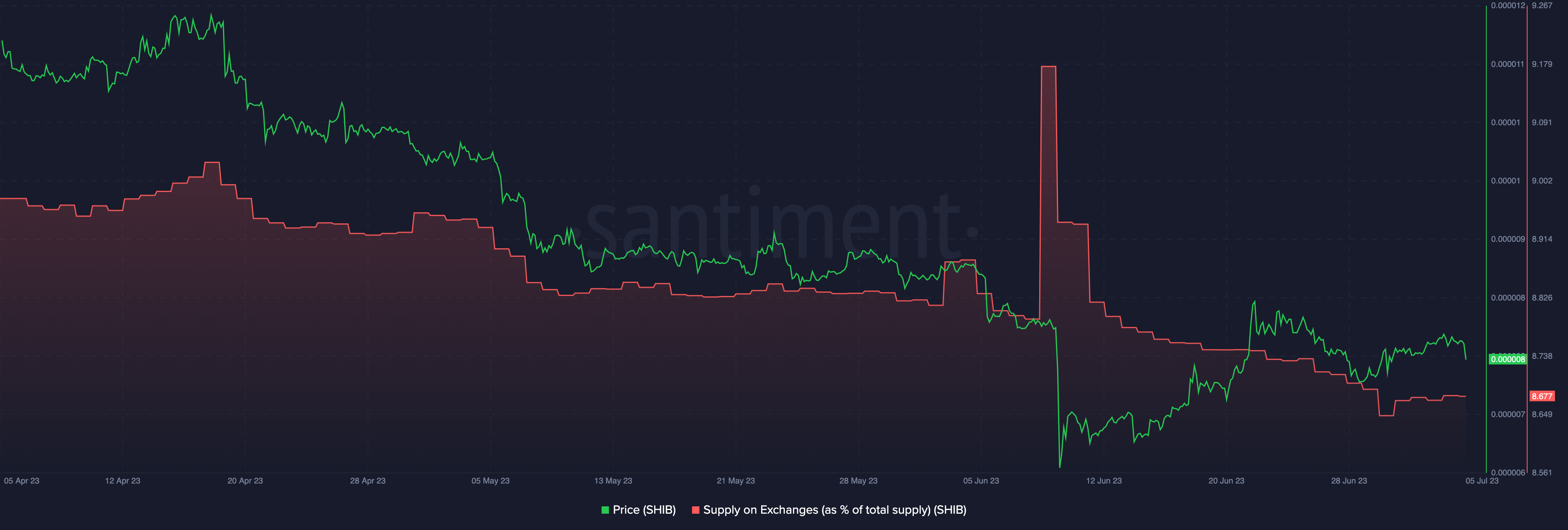 Tỷ lệ phần trăm nguồn cung của SHIB (trong tổng cung) đang có sẵn trên sàn, là 8%. Tỷ lệ này đang duy trì đà giảm liên tục trong cả quý vừa qua, và tiếp tục giảm trong tuần tháng 7 khi giá SHIB phục hồi.