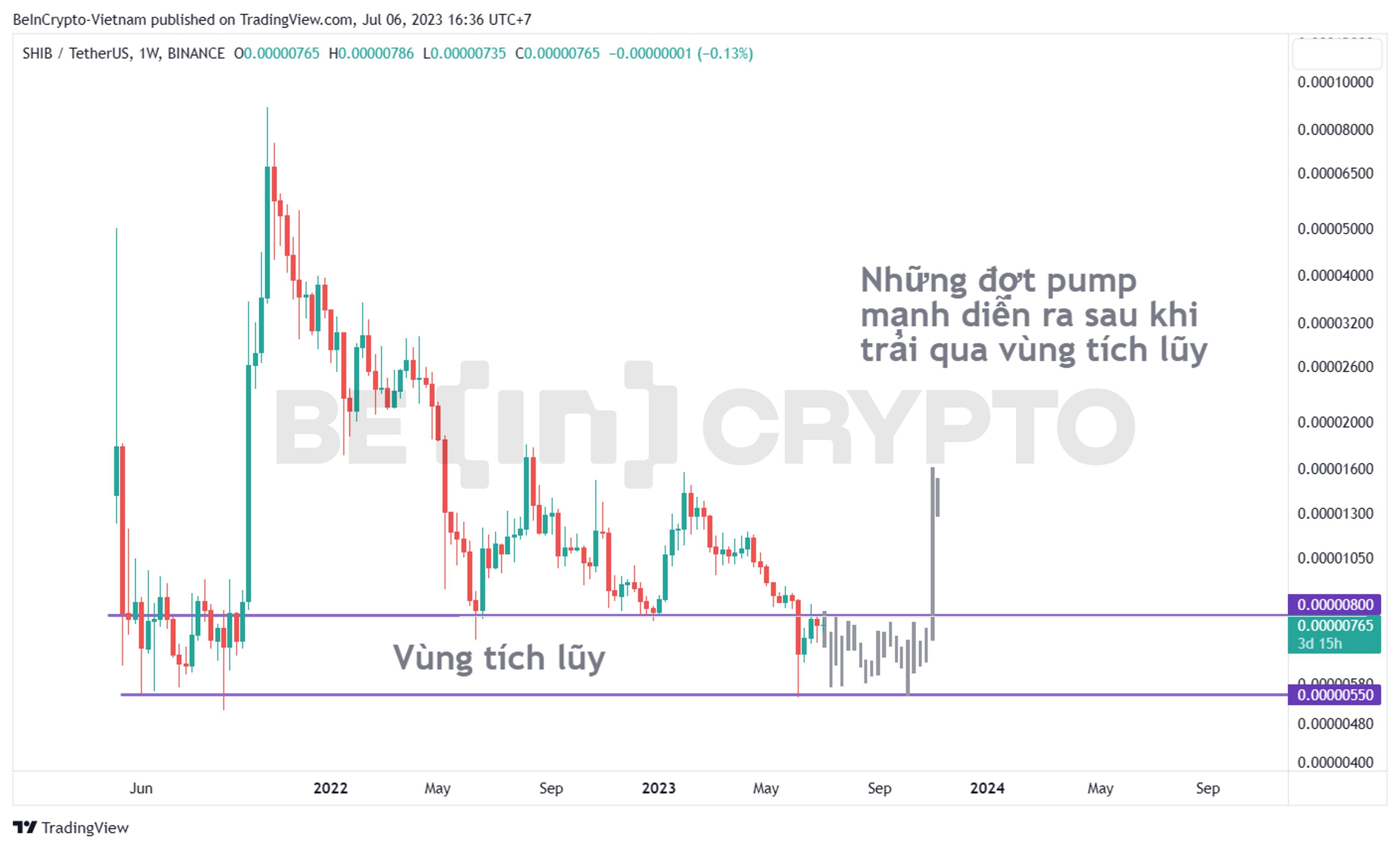 Đối với Memecoin, nhà đầu tư/đầu cơ thường có một lối chơi riêng. Khi tích lũy đủ, họ sẽ chờ đợi chốt lời. Và một khi giá tăng, đà tăng sẽ nhanh chóng trong một hoặc hai nến tuần nhưng biên độ rất lớn. Bạn có thể nhìn thấy rõ ràng điều này hơn qua biểu đồ giá SHIB dưới đây.