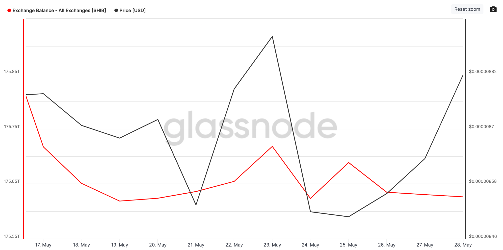 Cụ thể, biểu đồ bên dưới minh họa tổng số dư SHIB trên các sàn giao dịch đã giảm 92 tỷ token trong khoảng thời gian từ ngày 16 tháng 5 đến ngày 29 tháng 5.