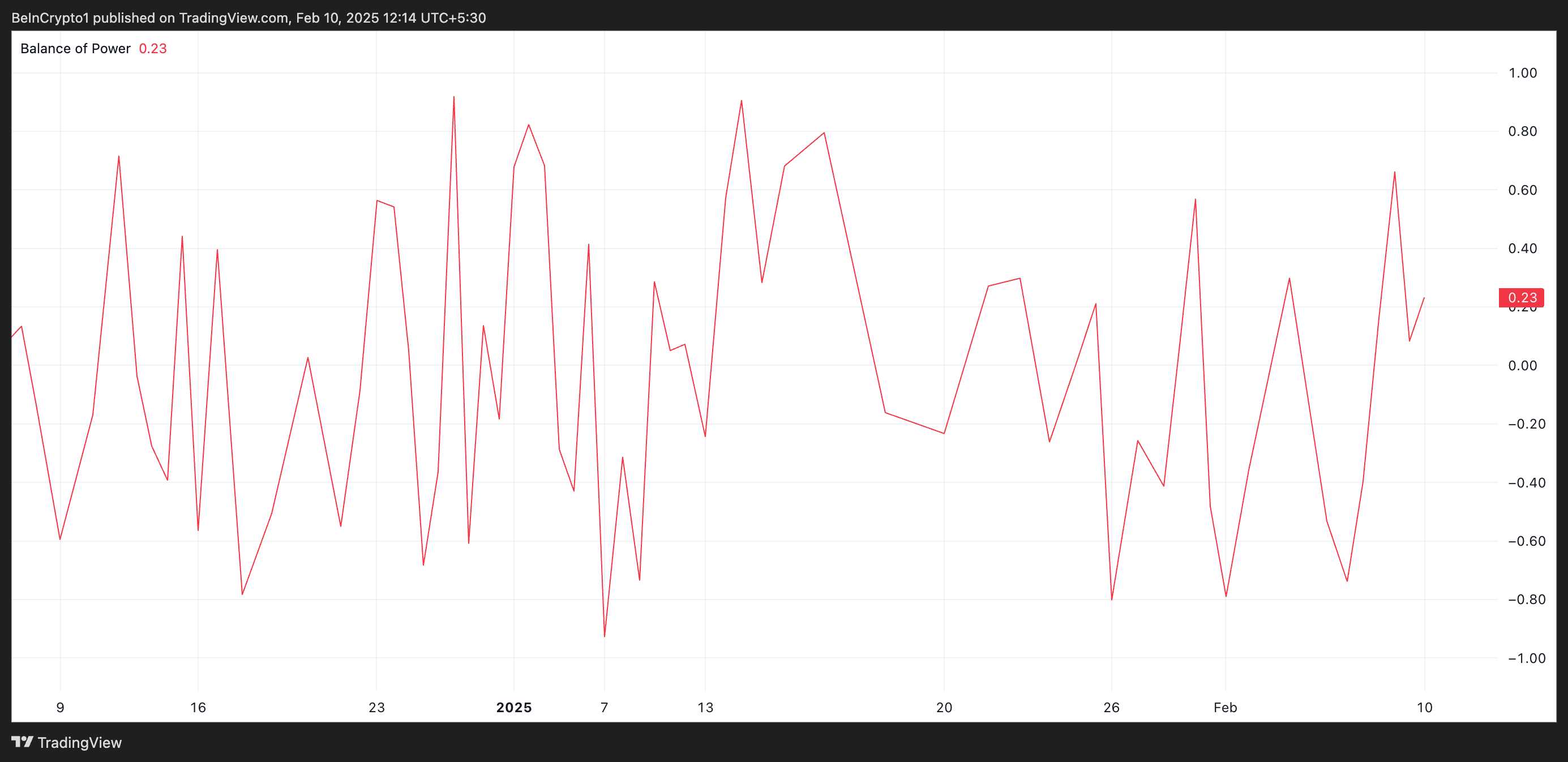 BoP đo lường sức mạnh của người mua so với người bán của một tài sản bằng cách so sánh biến động giá trong một khoảng thời gian nhất định. BoP dương cho thấy người mua đang kiểm soát, gợi ý động lượng tăng và khả năng tăng giá.