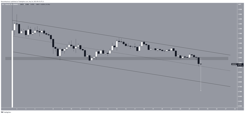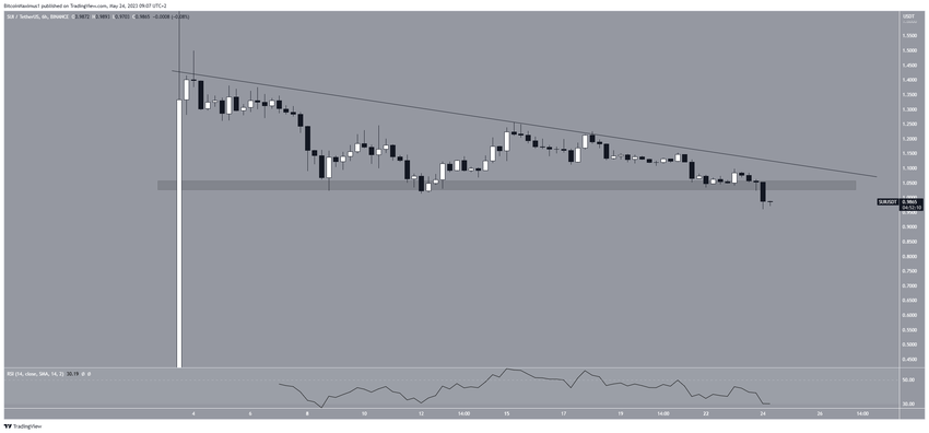 Hành động giá đã tạo ra một tam giác giảm dần, được coi là một mô hình giảm giá. Tam giác giảm dần thường dẫn đến việc phá vỡ khỏi vùng hỗ trợ. Vào ngày 24/5, giá SUI cuối cùng đã giảm xuống dưới vùng nằm ngang 1.05 USD, xác nhận sự phá vỡ khỏi tam giác.