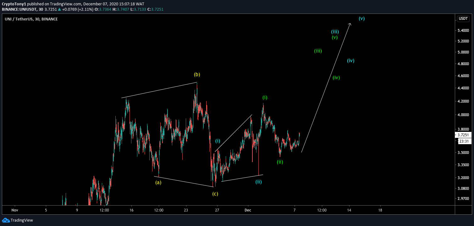 Trên Twitter, trader @CryptoTony đã phác thảo biểu đồ giá của UNI. Biểu đồ này cho thấy nó đã bắt đầu một làn sóng thứ ba mở rộng, có khả năng đưa nó lên trên mức $5.