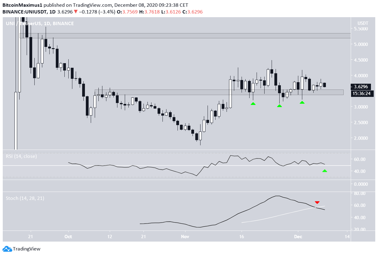 Sau khi tụt xuống mức đáy là $1,75, giá UNI đã tăng lên kể từ ngày 5 tháng 11. Vào ngày 12 tháng 11, UNI tiếp tục bứt phá lên trên vùng kháng cự $3,5. Hiện mức này đã đang trở thành ngưỡng hỗ trợ quan trọng.