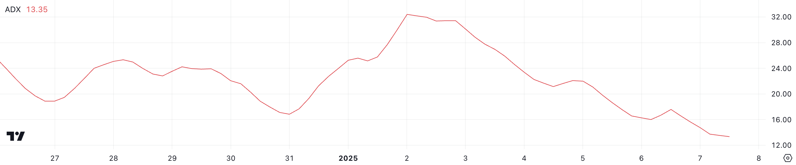 Ở mức 13.3, ADX phản ánh động lượng xu hướng tối thiểu, phù hợp với hành vi giá, cho thấy sự giảm biến động và chuyển động có hướng.