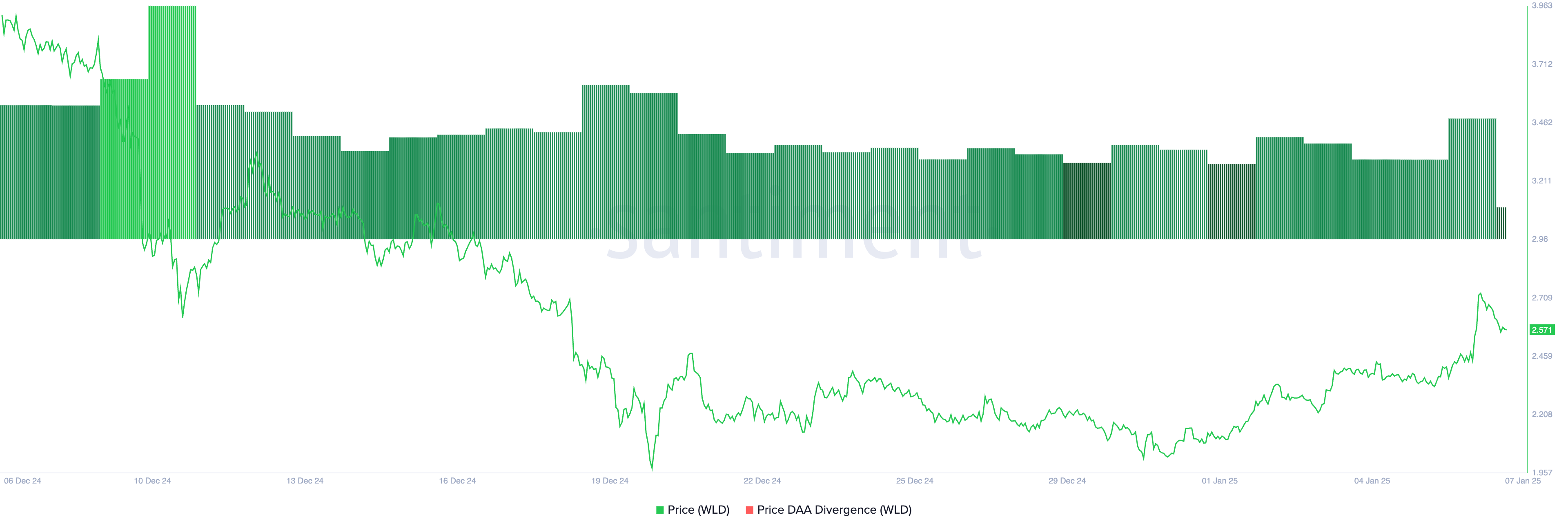 Hơn nữa, các chỉ số tích cực từ sự phân kỳ địa chỉ hoạt động hàng ngày (DAA) của giá WLD nhấn mạnh sự gia tăng trong sự tích lũy toàn thị trường của token, thúc đẩy đợt tăng giá hiện tại của nó.