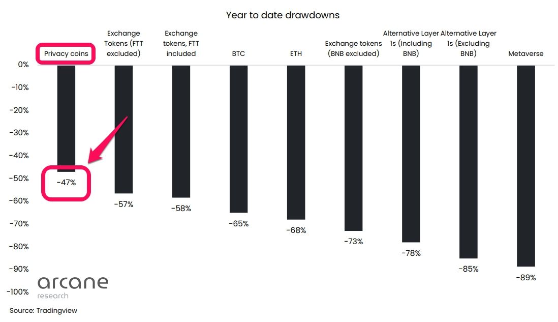 Thống kê của Arcane về biên độ suy giảm năm 2022 của các nhóm coin khác nhau trong thị trường cho thấy bức tranh về sức giữ giá như sau: