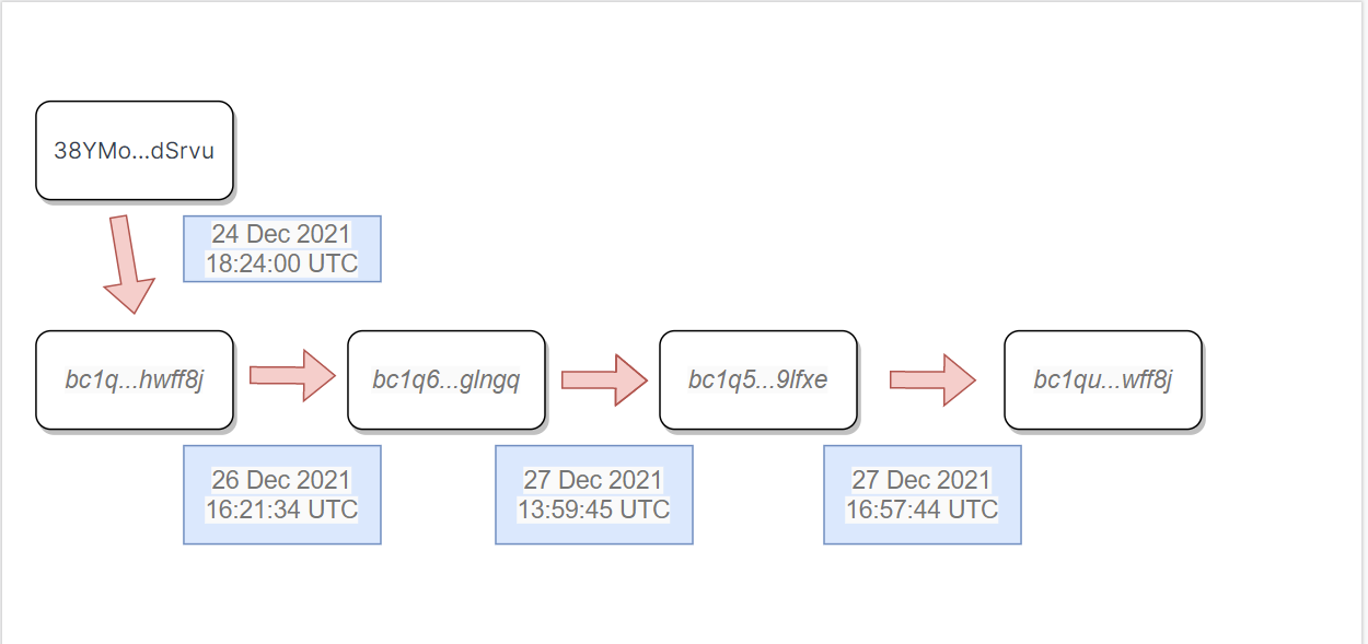 Kể từ chiều ngày 26/12 đến chiều ngày 27/12, hơn 15,000 BTC dịch chuyển qua 4 địa chỉ ví. Thực tế thì một địa chỉ 38YMo…dSrvu đã chuyển 15,052 BTC đến ví bc1q…hwff8j vào ngày 24/12. Nhưng trong hai ngày sau đó, ví bc1q…hwff8j không thực hiện giao dịch nào.