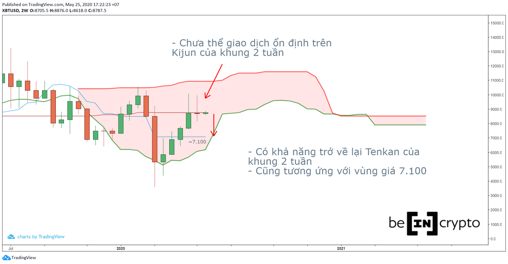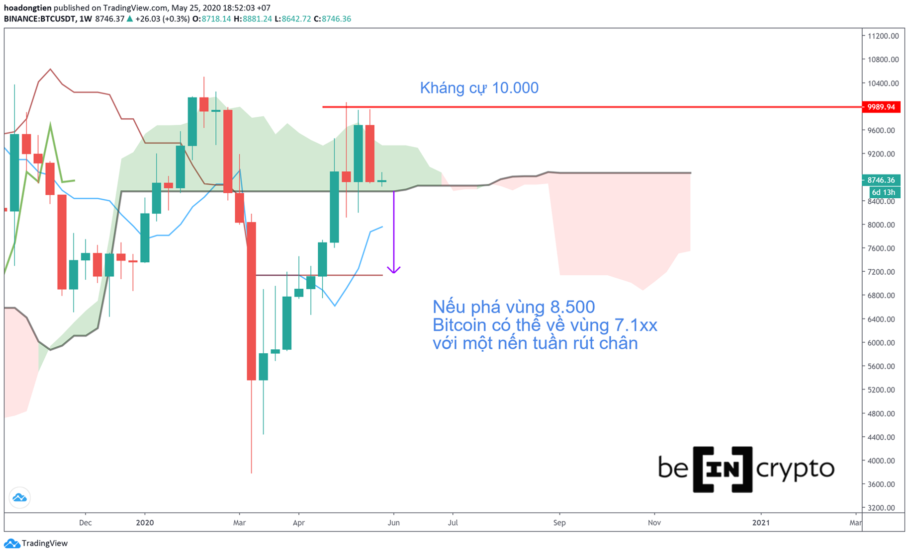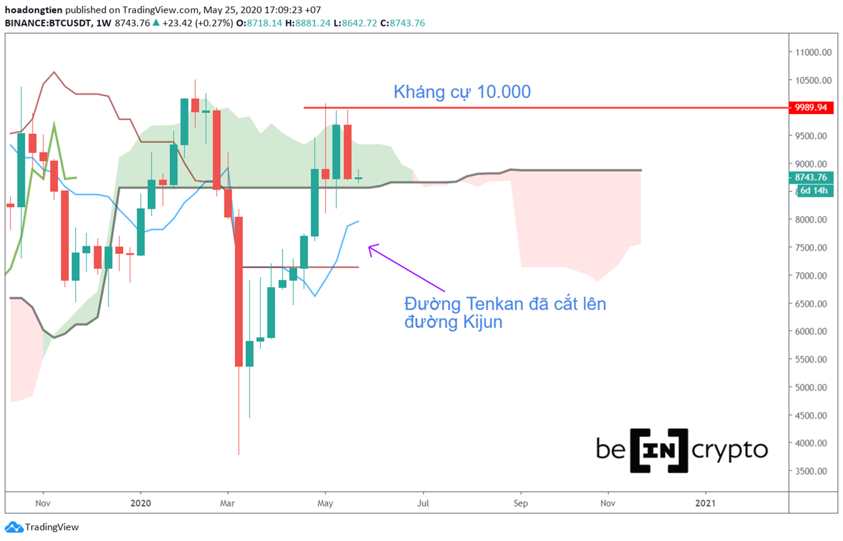 Trong bài viết lý giải vì sao 8.500 đô la là vùng giá quan trọng, chúng tôi cũng đã đưa ra kịch bản Bitcoin sẽ tiếp cận 10.000 đô la và đảo chiều, nhưng khi đó đường Tenkan chưa cắt lên đường Kijun trong khung tuần.
