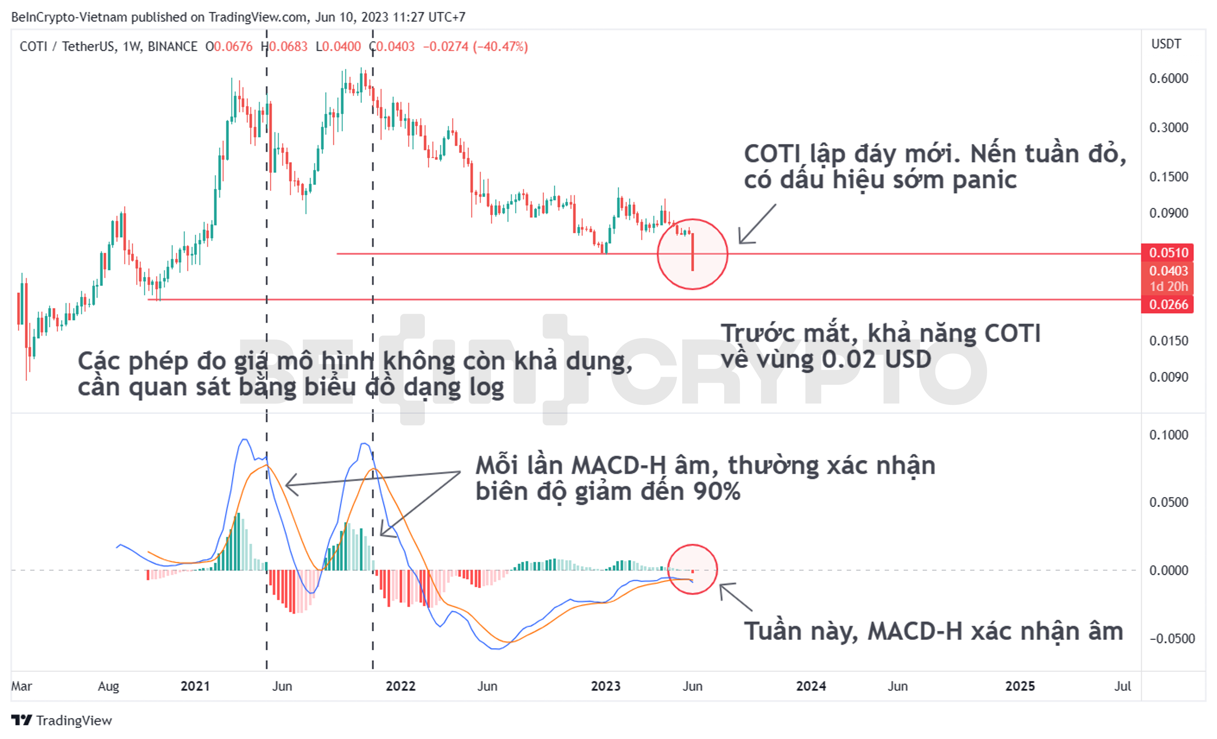 - Chỉ báo MACD-H khung tuần chỉ ra rằng, mỗi lần histogram âm thì đều xác nhận biên độ giảm từ đỉnh gần nhất là -90%. COTI có thanh khoản kém hơn nên biên độ giảm lớn hơn. Điều đáng chú ý là tuần này vừa ghi nhận một thanh histogram 1W âm lần đầu tiên trở lại sau gần một năm.