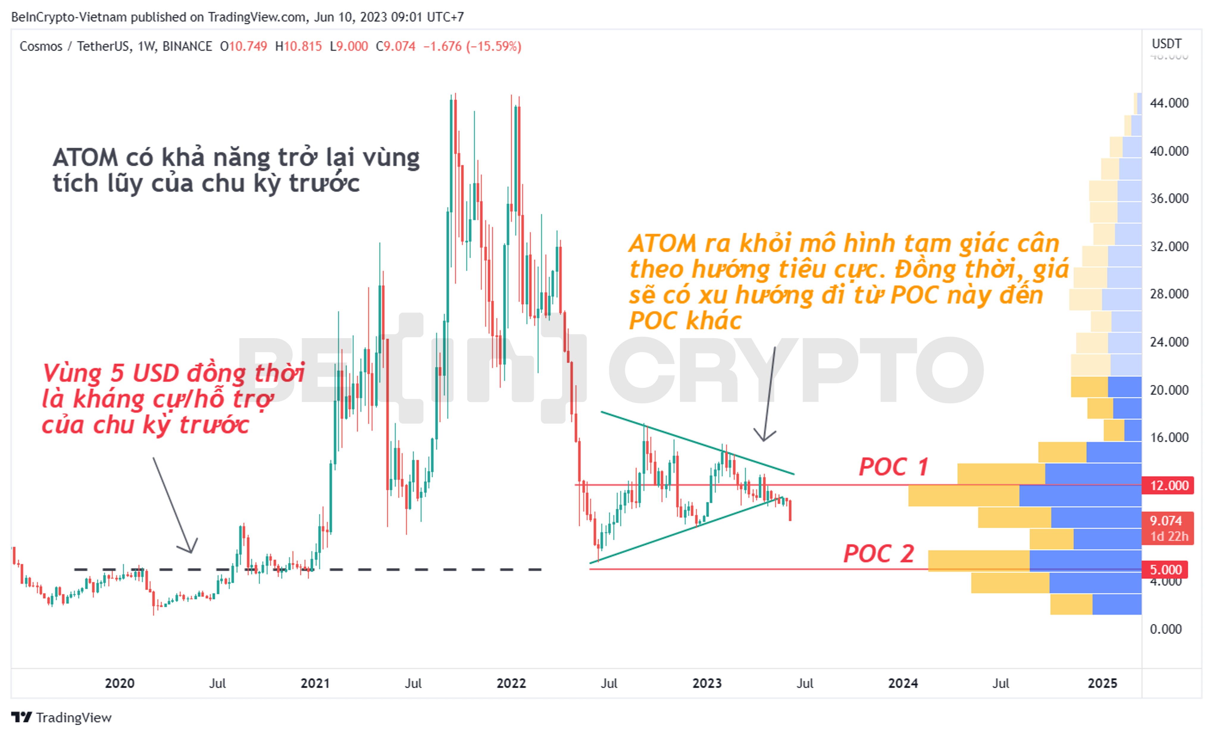 Mô hình tam giác cân trong khung tuần (1W) đã không tạo được một Higher High nào trong nửa đầu năm 2023. Đà bán tháo những ngày qua đã khiến ATOM phá khỏi mô hình này theo hướng tiêu cực.