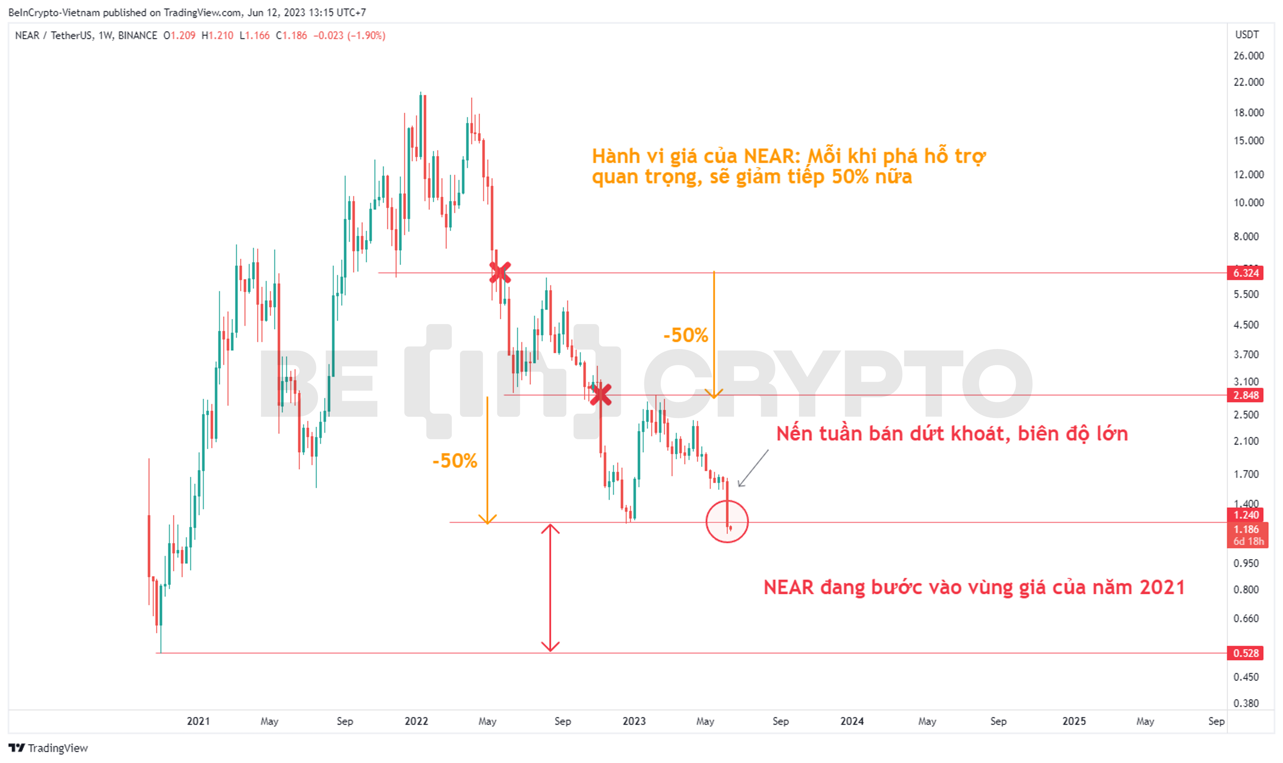 - Đặc tính thứ 2, đó là NEAR thường có hành vi giảm tiếp 50% sau mỗi lần hỗ trợ khung tuần bị phá vỡ (minh hoạt trên hình). Điều này tạo nên những bước giá thể hiện xung lực bán của NEAR như một thói quen trong downtrend đối với các nhà đầu tư NEAR. Do đó, việc NEAR phá vỡ hỗ trợ 1.2 USD lần này khiến cho khả năng NEAR giảm về vùng 0.5 – 0.6 USD trở nên cao hơn.