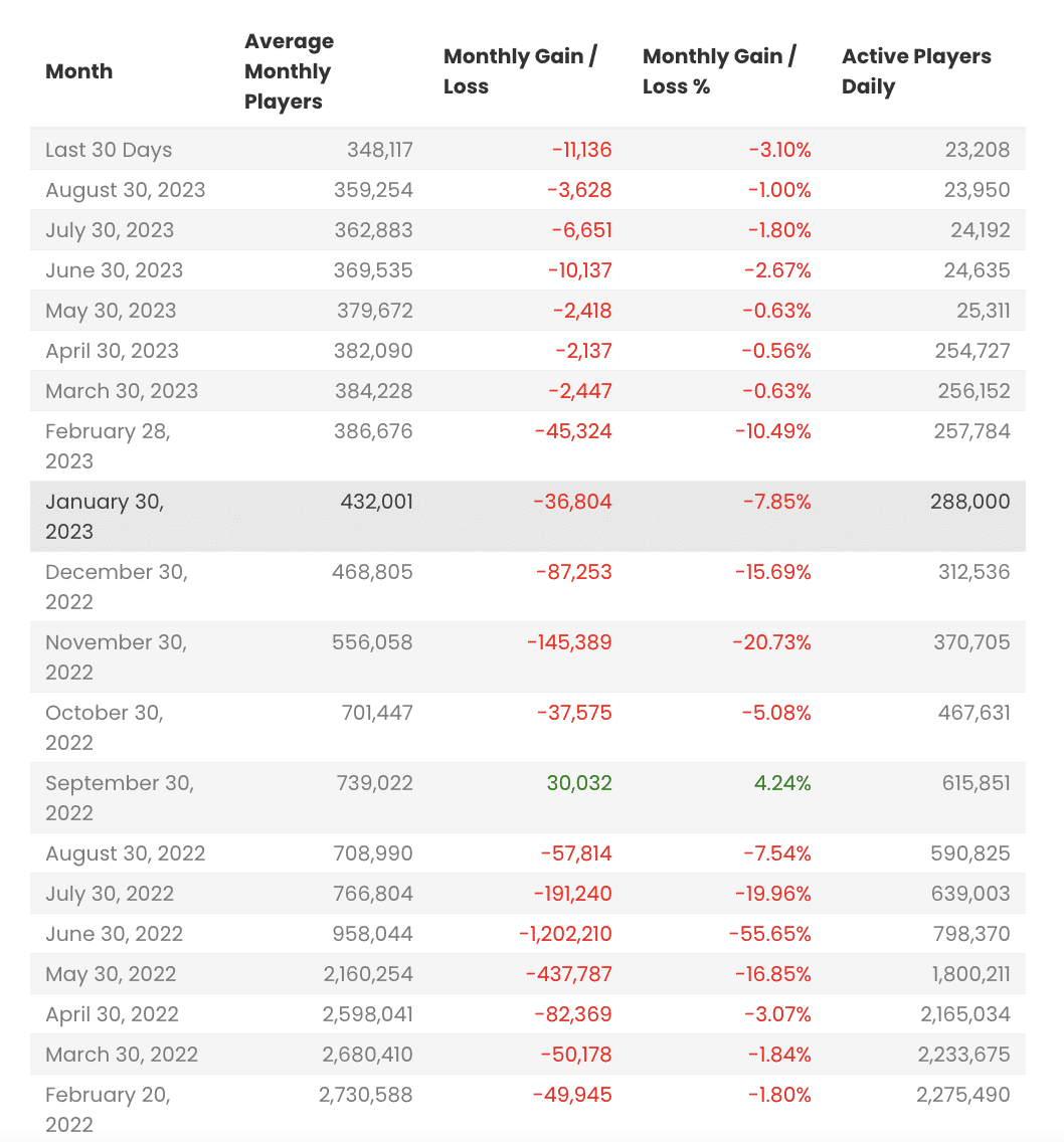 Từ mức hơn 288,000 người hàng tháng chơi đầu năm 2023 nay chỉ còn 23,200 người, tức giảm hơn 90% trong năm 2023. Axie Infinity đã không còn hấp dẫn trong mắt người chơi, không thể có thêm người chơi mới. Do đó, sức thanh khoản và tương lai của AXS có thể là một câu hỏi nhiều hoài nghi.