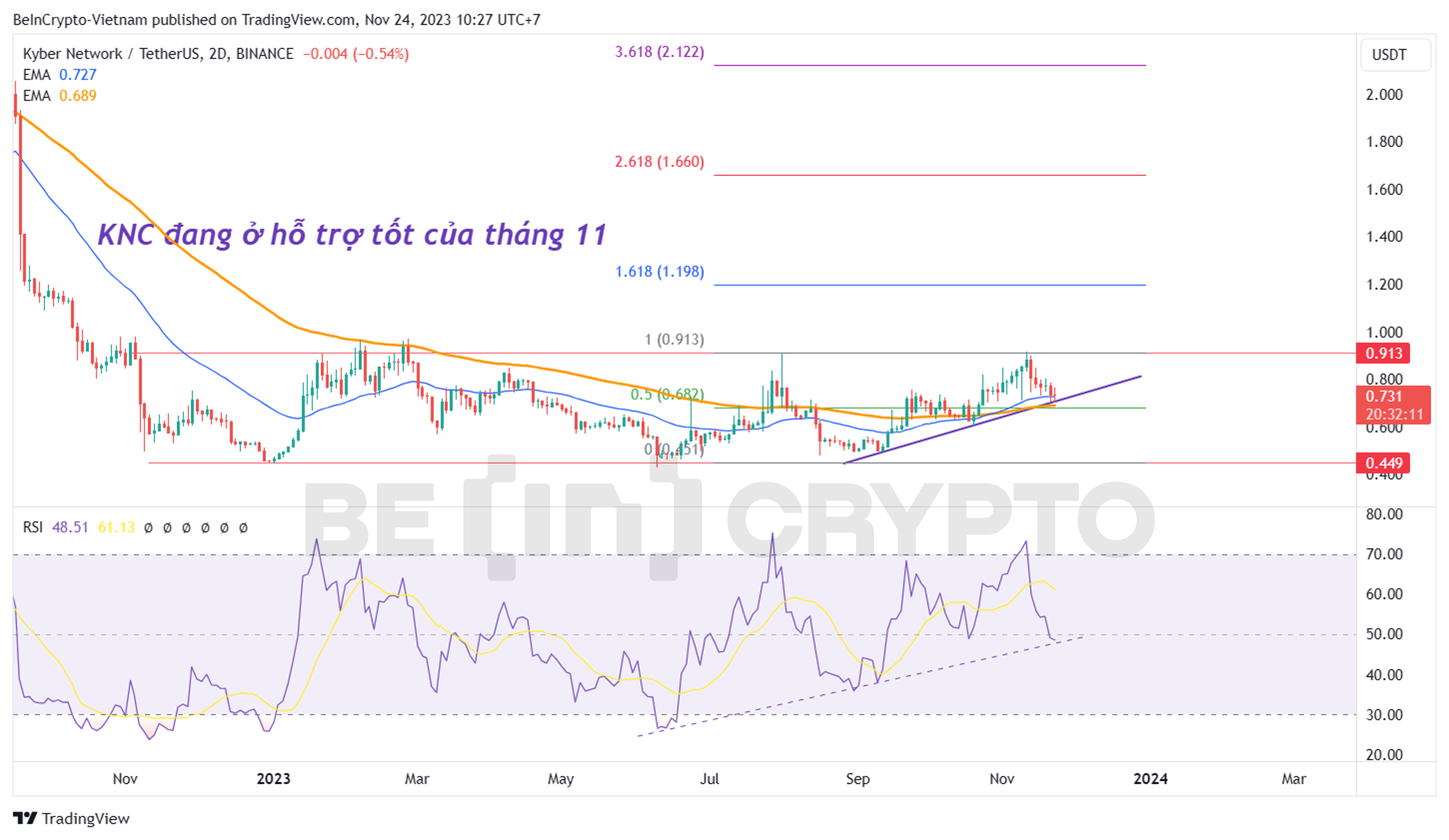 - Trong không gian giá, KNC vẫn nằm trong biên độ sideway của năm 2023, giữa 0.45 USD – 0.90 USD. Hiện giá đang ở hỗ trợ của fibo 0.5 tại 0.68 USD. Hỗ trợ này cũng trùng khớp với trendline hỗ trợ của giá KNC từ tháng 9 đến nay.