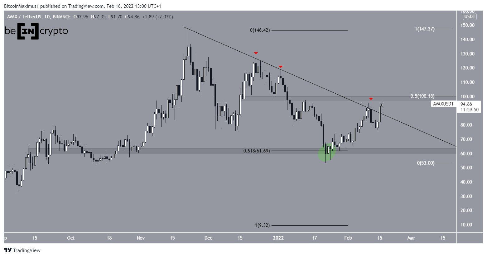 Giá AVAX đã giảm theo một đường kháng cự giảm dần kể từ mức đỉnh lịch sử tại 147 USD vào ngày 21 tháng 11. Đường này đã từ chối AVAX ba lần (các biểu tượng màu đỏ), với lần đây nhất là vào ngày 10 tháng 2.