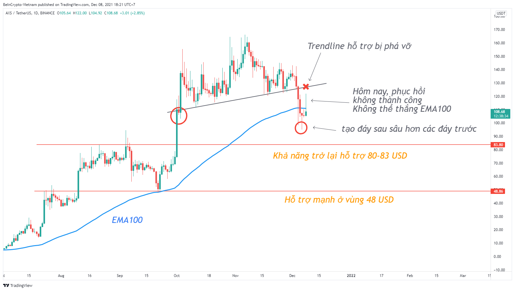- Hiện tại có hai hỗ trợ quan trọng đối với giá AXS/USDT, thứ nhất là vùng hỗ trợ ở 80-83 USD, và thứ hai là hỗ trợ sâu hơn ở 48 USD nếu BTC biến động bất lợi.