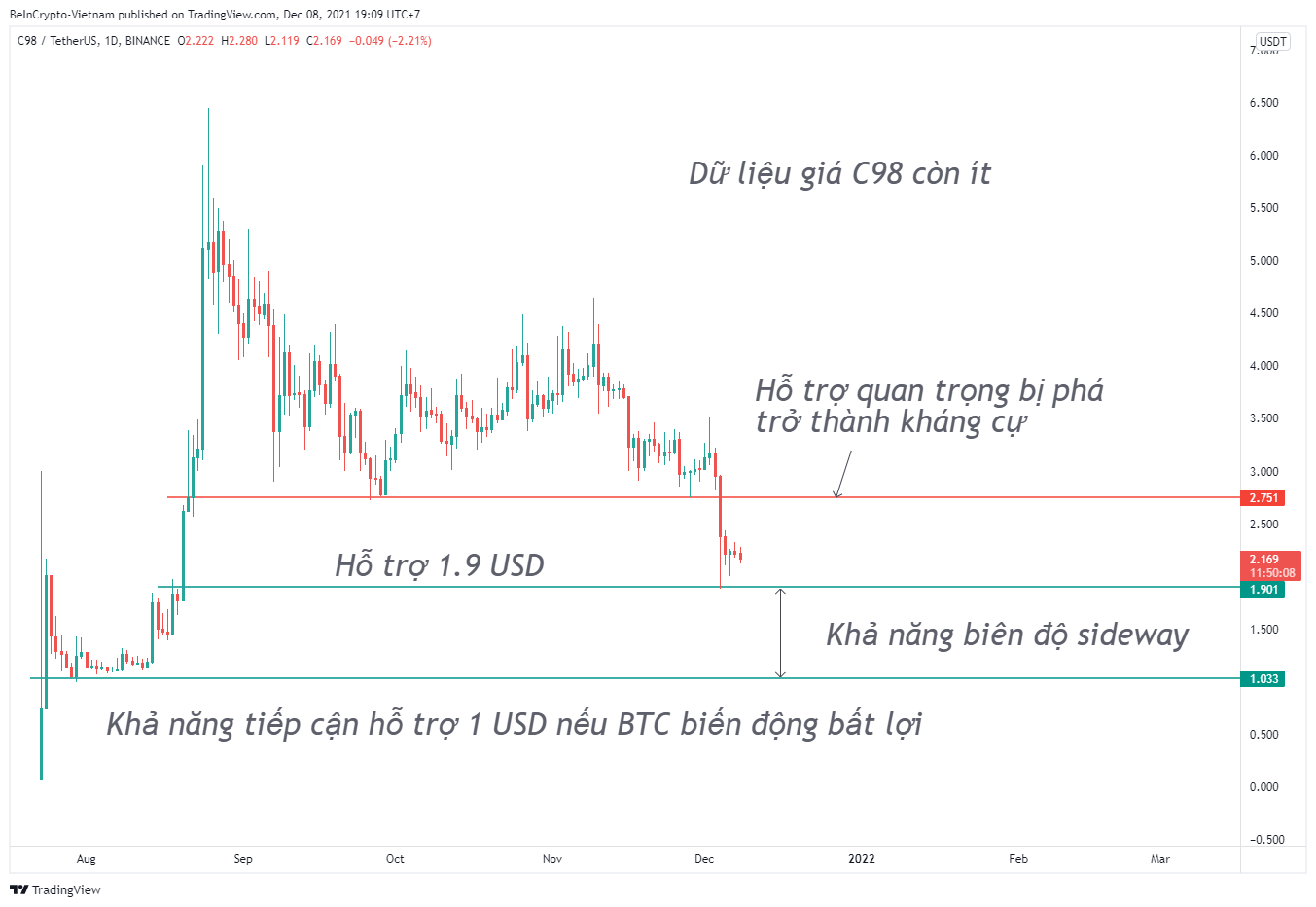 - Nếu một nhịp giảm thứ hai xảy ra giá C98 có thể chạm đến hỗ trợ tiếp theo ở 1 USD. Đây cũng là mức giá tâm lý đối với nhiều holder tin tưởng dự án khi được niêm yết trên sàn hồi tháng 8.