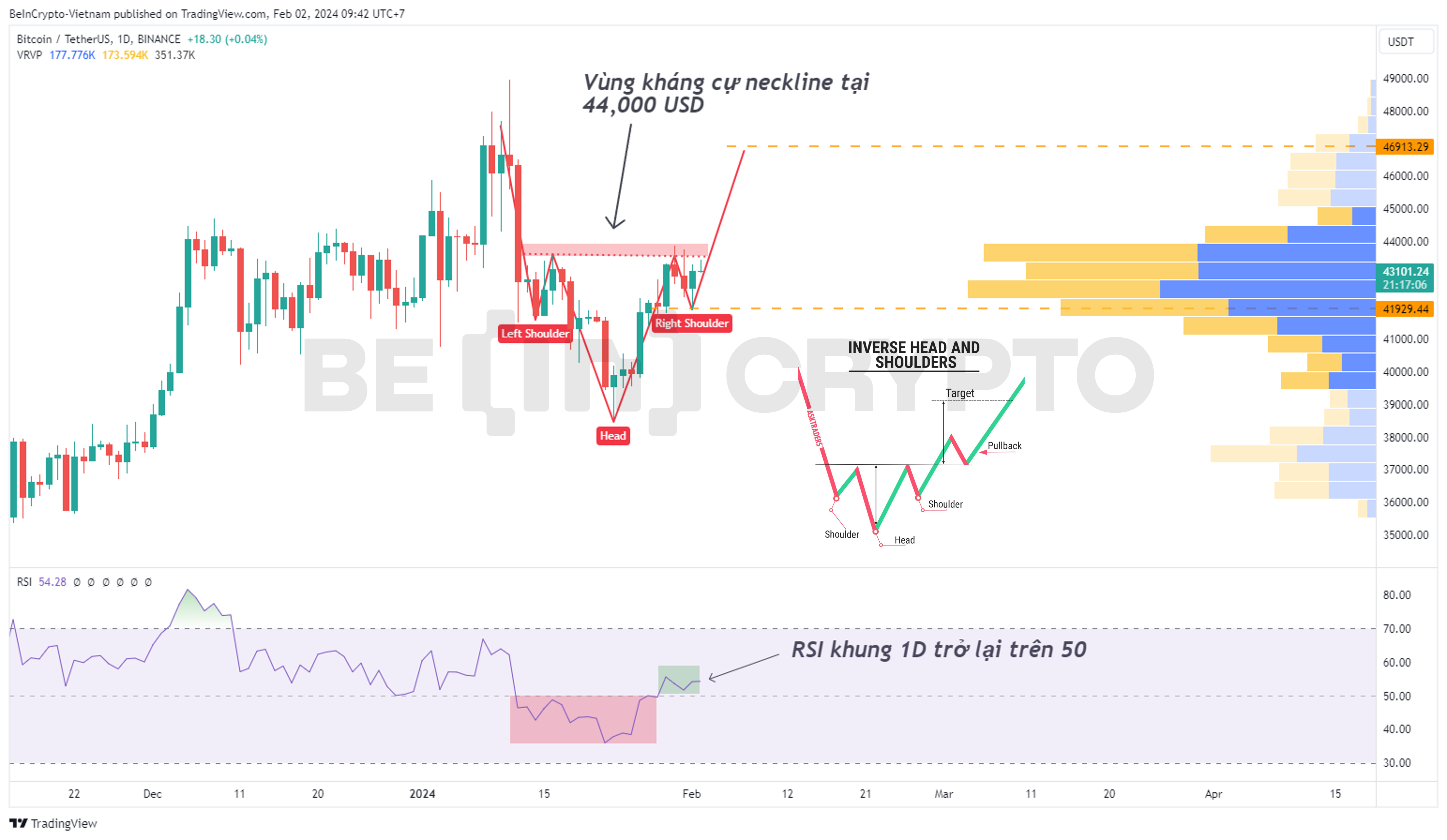 Do đó, kỳ vọng mua ngắn hạn có thể cân nhắc cắt lỗ khi giá giảm về dưới 42,000 USD, tức thấp hơn mức thấp của vai phải của mô hình vai đầu vai ngược nói trên.