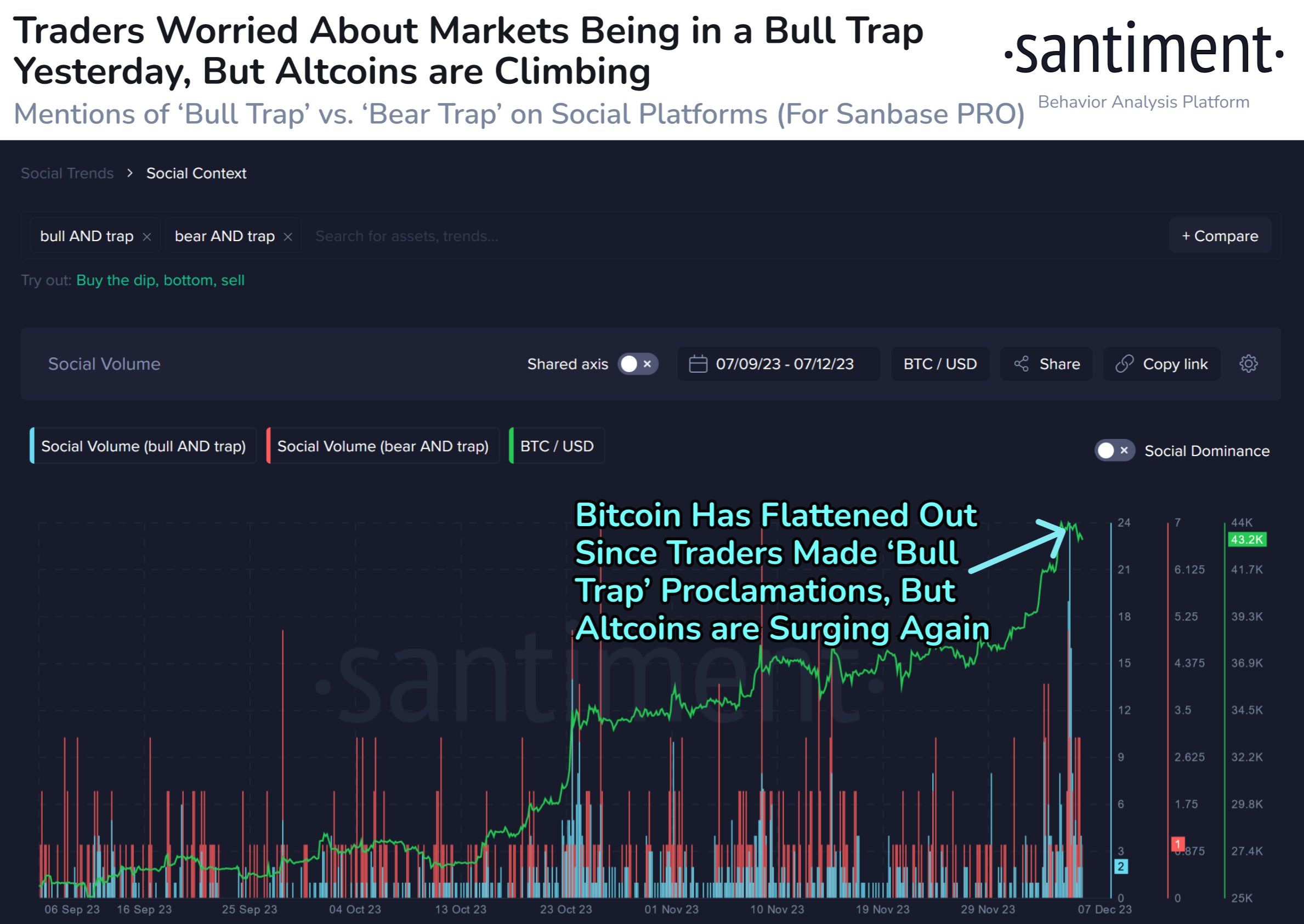 Dữ liệu Social Volume từ Santiment cho thấy nhiều nhà giao dịch đang lo ngại về bull trap khi lượng đề cập đến chủ đề này tăng đột biến trong hơn 3 tháng qua. Điều này phần nào phản ánh tâm lý dè chừng của những nhà giao dịch. Quan sát cộng đồng gần đây, rất nhiều nhà đầu tư cá nhân đã đứng ngoài đà tăng đầu tháng 12 này vì nhiều lý do khác nhau.