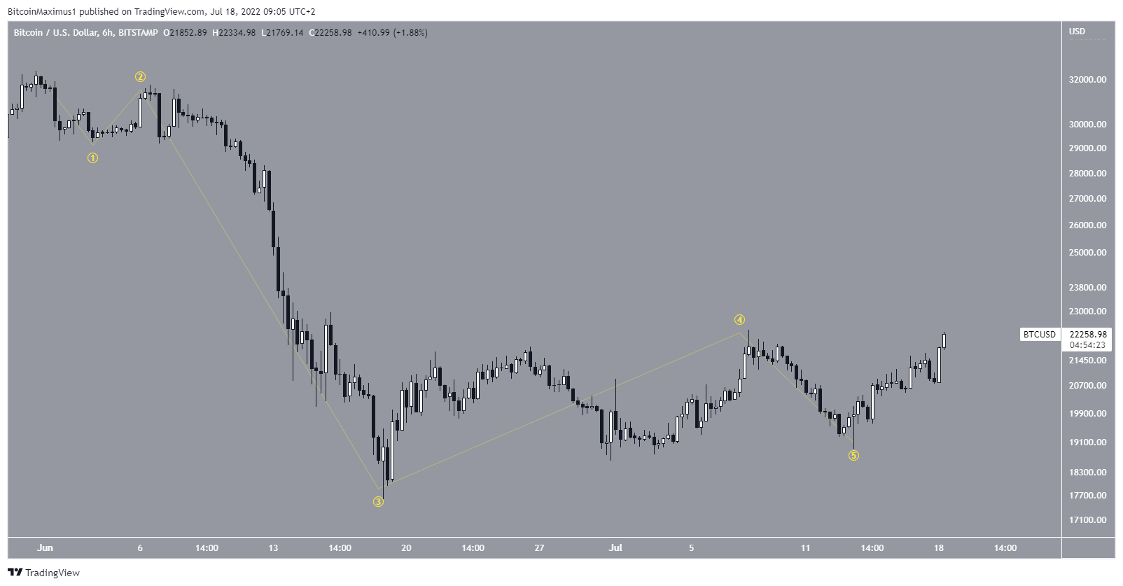 Số lượng sóng có khả năng xảy ra nhất cho thấy giá đã hoàn thành một đợt giảm gồm 5 sóng (màu vàng), đo lường từ đầu tháng Tư. Do độ dài quá lớn của sóng bốn, có vẻ như sóng thứ năm và sóng cuối cùng đã bị cắt ngắn, do đó nó không thể di chuyển xuống dưới đáy của sóng thứ ba.