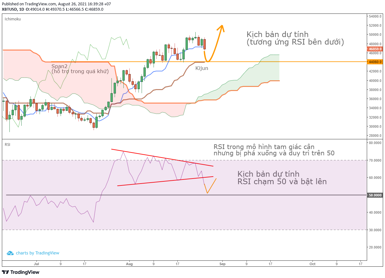 - Như hình vẽ, kịch bản sẽ là RSI tiến cận vùng 50 sau khi phá khỏi tam giác cân trên. Tương ứng với đó, giá Bitcoin sẽ tiếp cận hỗ trợ gần nhất là đường Kijun tại vùng 44,000 đô la. 44,000 đô la là hỗ trợ đáng tin nhất trong vài ngày tới.