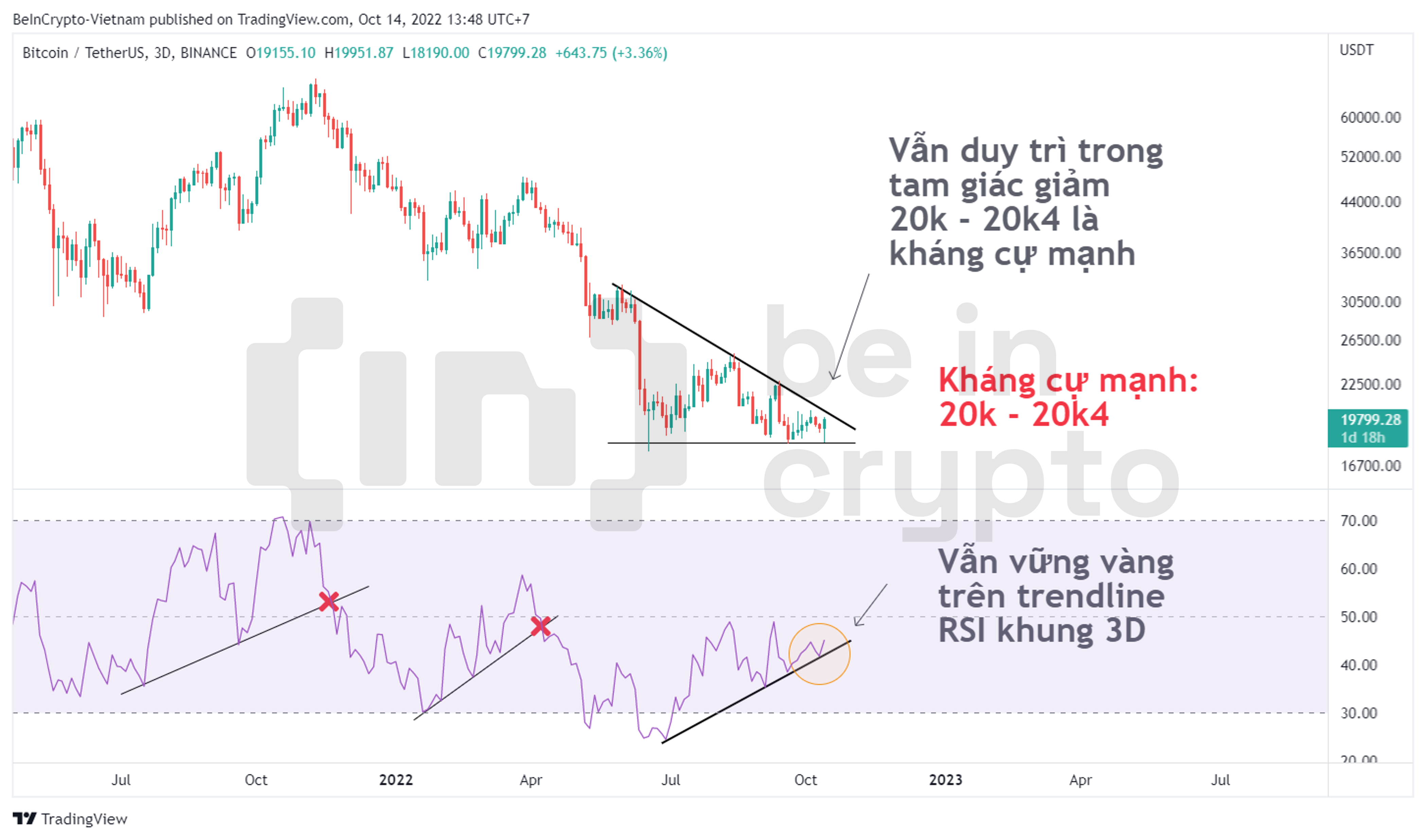 Một trong 10 dấu hiệu cần lưu ý khi phân tích kỹ thuật Bitcoin trong giai đoạn này là trendline của chỉ báo RSI khung 3D.