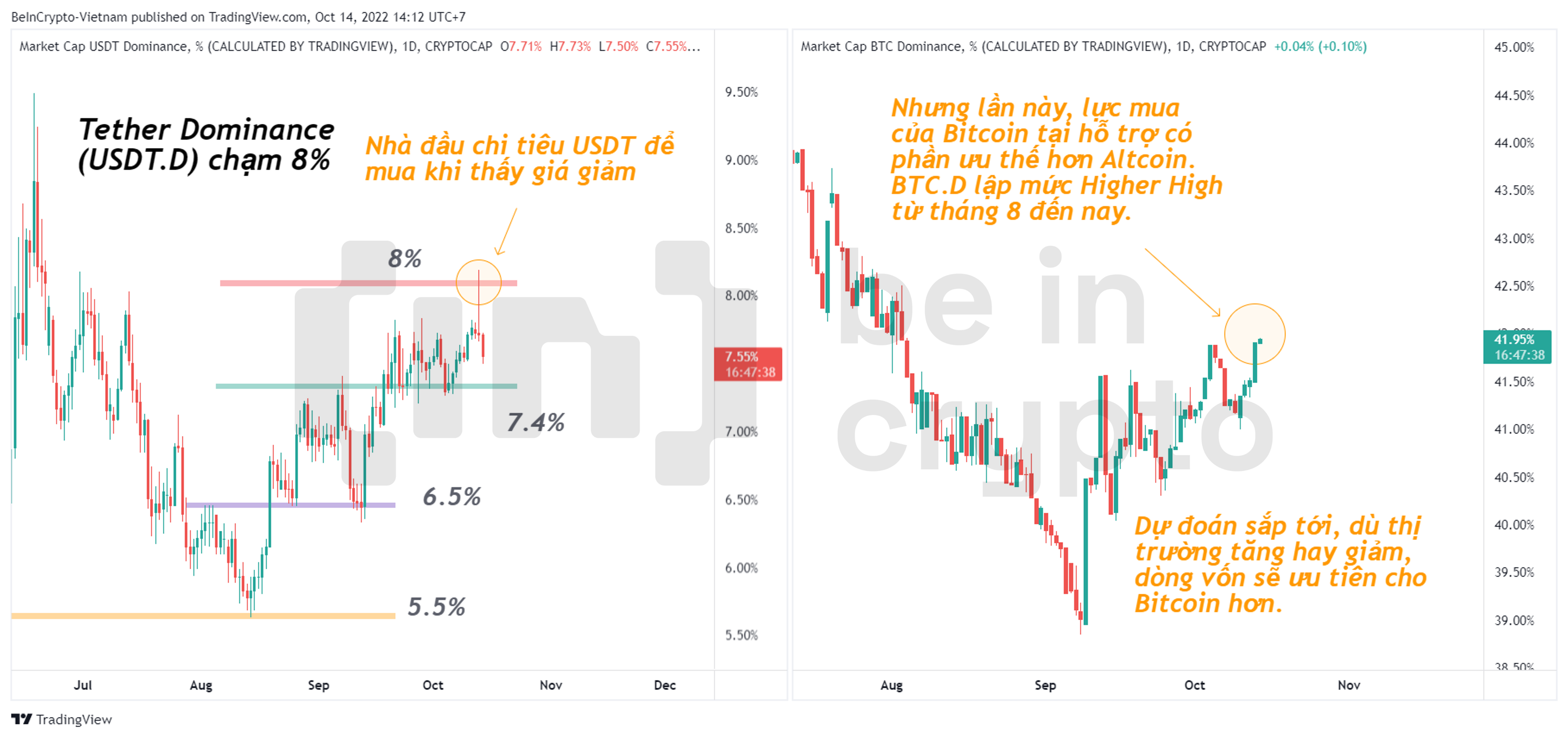 - Lần mua này đặc biệt ở chỗ, nó kéo theo BTC.D tăng và lập Higher High của hơn 2 tháng qua. Dự đoán sắp tới, dù thị trường tăng hay giảm thì dòng vốn sẽ vẫn còn tiếp tục ưu tiên cho Bitcoin. Bitcoin sẽ vẫn củng cố vị thế lưu trữ niềm tin khi toàn thị trường Crypto bất ổn.