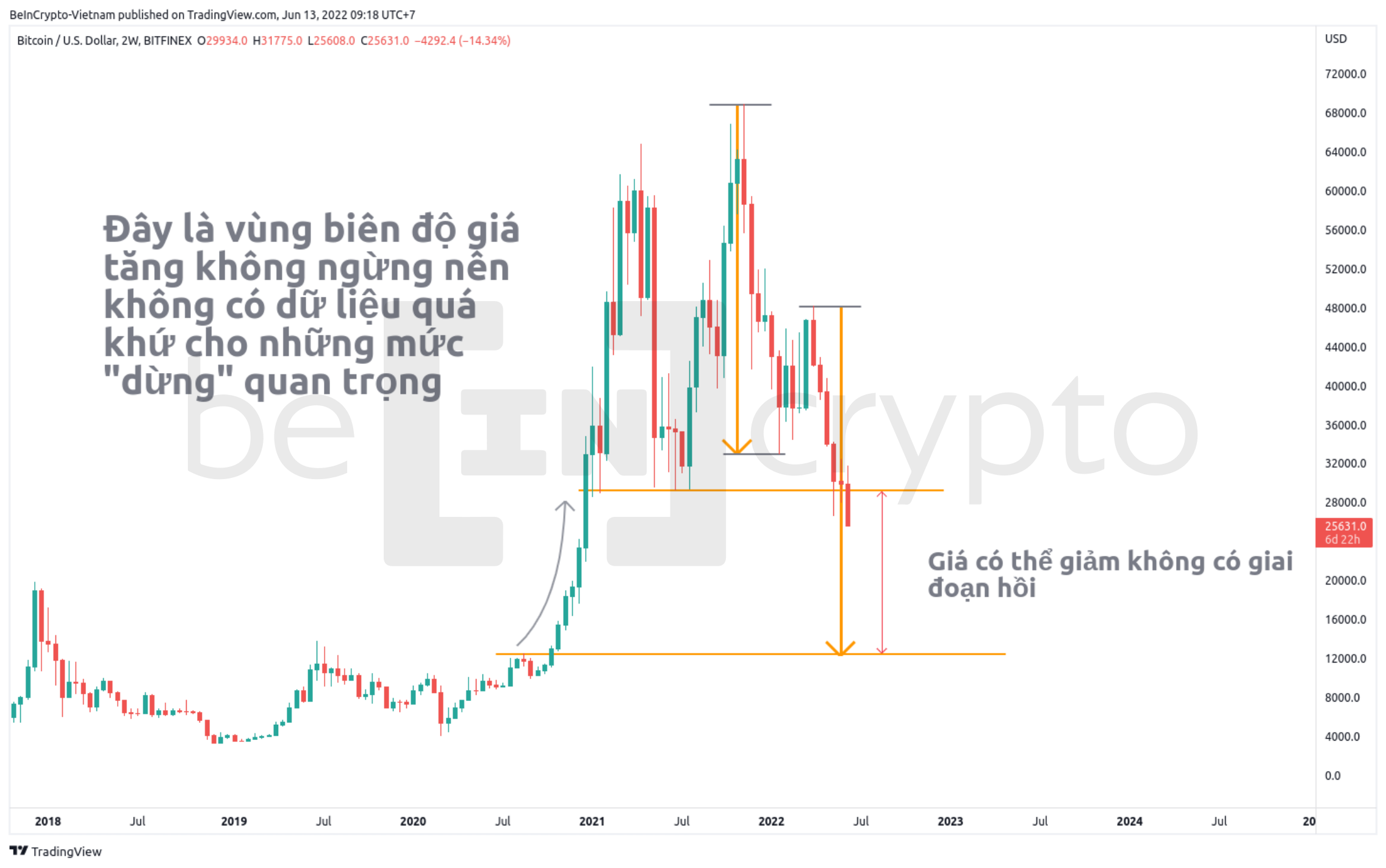 - Cần lưu ý rằng biên độ giữa 26,000 USD và 12,5000 USD là vùng biên độ mà trong quá khứ giá Bitcoin đã tăng không có giai đoạn dừng. Do đó, chúng ta hoàn toàn không có dữ liệu trong việc xác định kháng cự/hỗ trợ trong biên độ này.