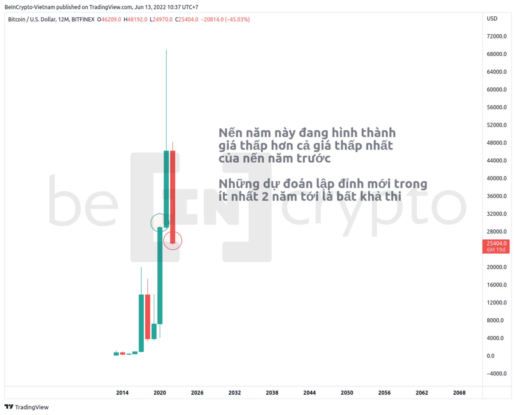 Có thể thấy rằng, giá Bitcoin năm 2022 đang tạo giá thấp hơn giá thấp nhất của nến năm trước. Điều này có nghĩa giá thấp nhất của nến 2022 này sẽ phủ nhận toàn bộ nỗ lực tăng giá của BTC năm 2021. Điều đó khiến cho những dự đoán bullish cho rằng BTC lập đỉnh mới trong ít nhất 2 năm tới sẽ bất khả thi.