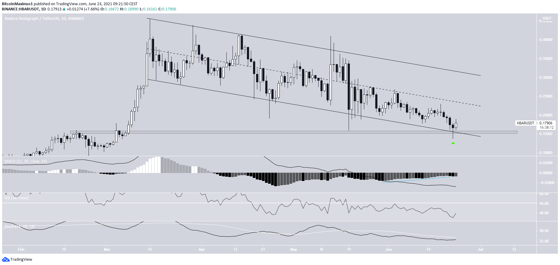 Vào ngày 22 tháng 6, giá đã bật lên tại đường hỗ trợ của kênh này. Cùng với vùng hỗ trợ khác tại mốc $0,155, giá đã tạo ra một râu nến dài bên dưới.