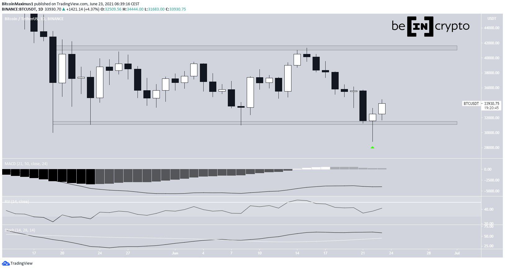 BTC đã giảm đáng kể vào ngày hôm qua, xuống mức thấp $28,805. Tuy nhiên, giá đã bật lên gần như ngay lập tức sau đó và tạo ra một cây nến búa tăng. Sau đó, nó đã lấy lại vùng hỗ trợ ngang $31,300.