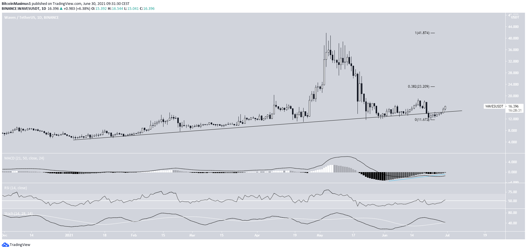 Vào ngày 23 tháng 6, giá WAVES dường như đã quay đầu giảm xuống nhưng đã nhanh chóng lấy lại đường hỗ trợ này ngay sau đó.