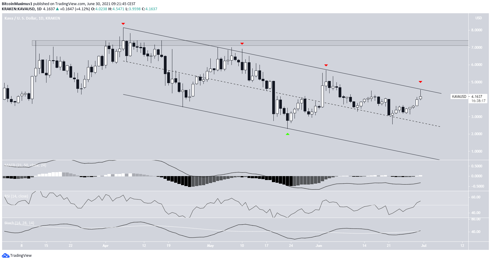 Giá KAVA đã giảm bên trong kênh giá song song giảm dần kể từ ngày 26 tháng 4. Vào ngày 23 tháng 5, KAVA bắt đầu tăng trở lại (biểu tượng màu xanh lá cây). Hiện tại KAVA đã đạt đến đường kháng cự của kênh. Đây là lần thứ tư giá KAVA chạm tới vùng kháng cự này (các biểu tượng màu đỏ).