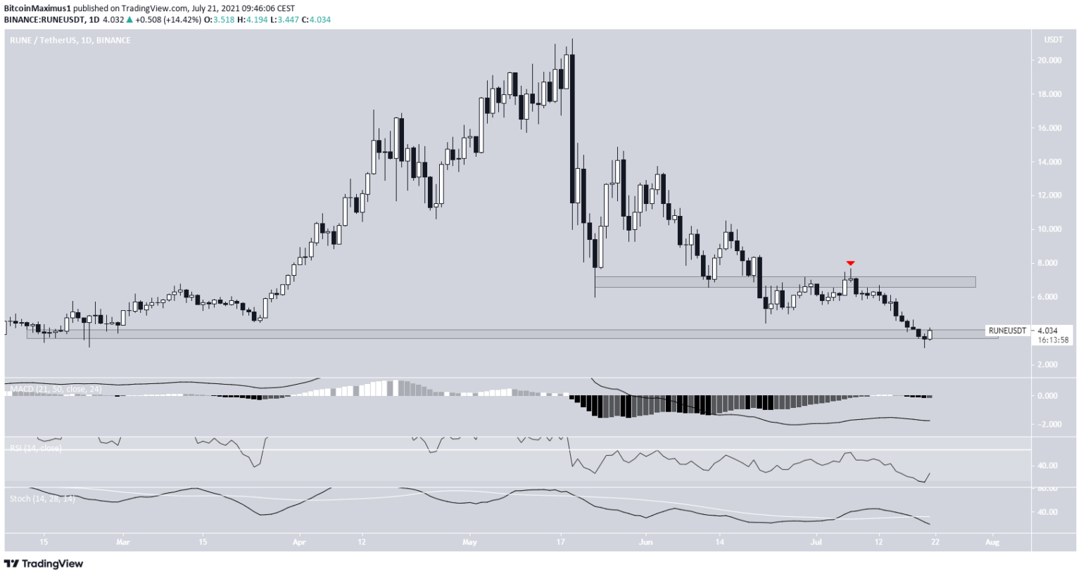 Vào ngày 20 tháng 7, RUNE đạt mức thấp nhất là $3,01 và tăng mạnh trở lại. Việc tăng giá đã xác thực vùng hỗ trợ ngang $3,60.