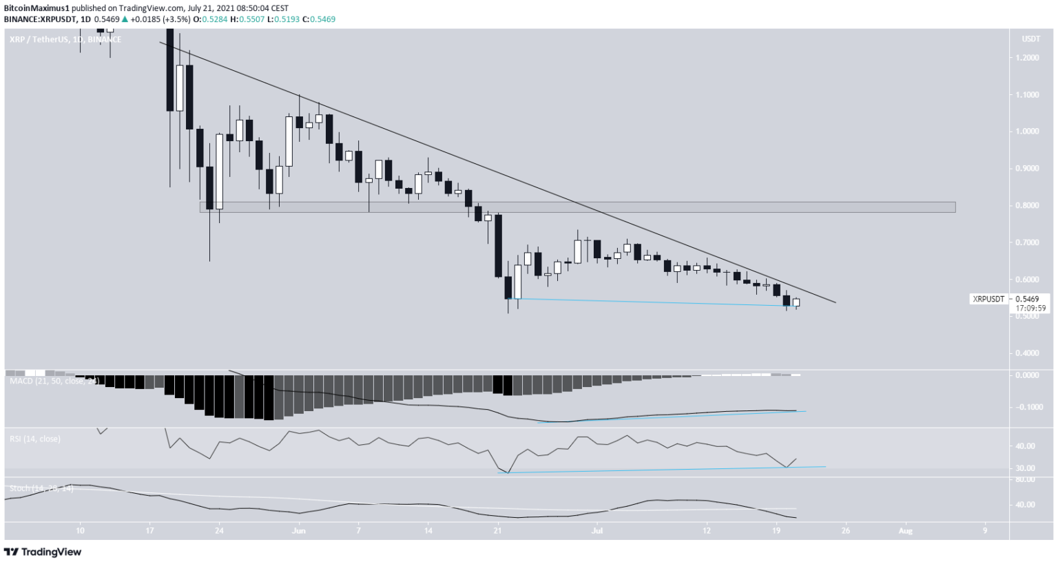 XRP đã giảm theo đường kháng cự giảm dần kể từ ngày 20 tháng 5. Vào ngày 22 tháng 6, XRP đạt mức thấp nhất là 0,50 đô la và tăng trở lại.