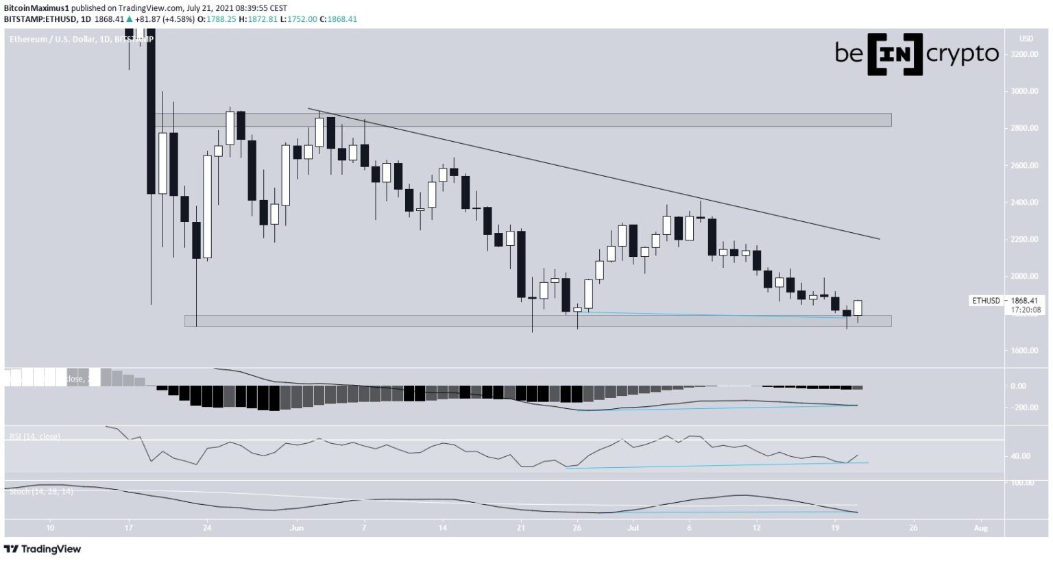 Vào ngày 20 tháng 7, ETH chạm mức thấp nhất là $1,717. Mức thấp được kết hợp với sự phân kỳ tăng trong MACD, RSI và Stochastic Oscillator.