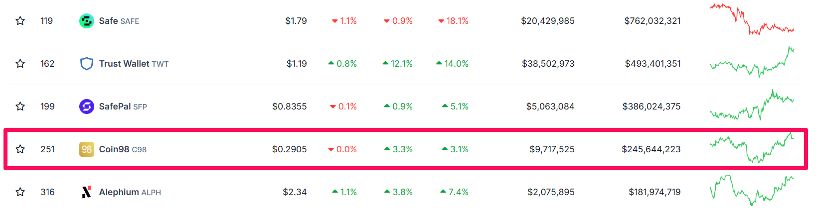 Coin98 (C98) vẫn là một trong những ứng dụng ví hàng đầu về vốn hóa thị trường