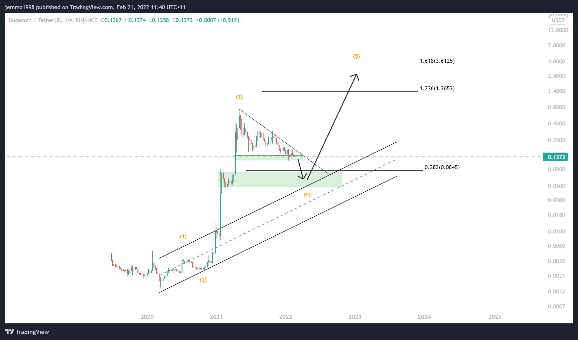 Mô hình sóng khả thi nhất cho thấy DOGE đang ở trong sóng bốn trong năm sóng đi lên. Tuy nhiên, hình dạng chính xác của sóng 4 vẫn chưa rõ ràng.