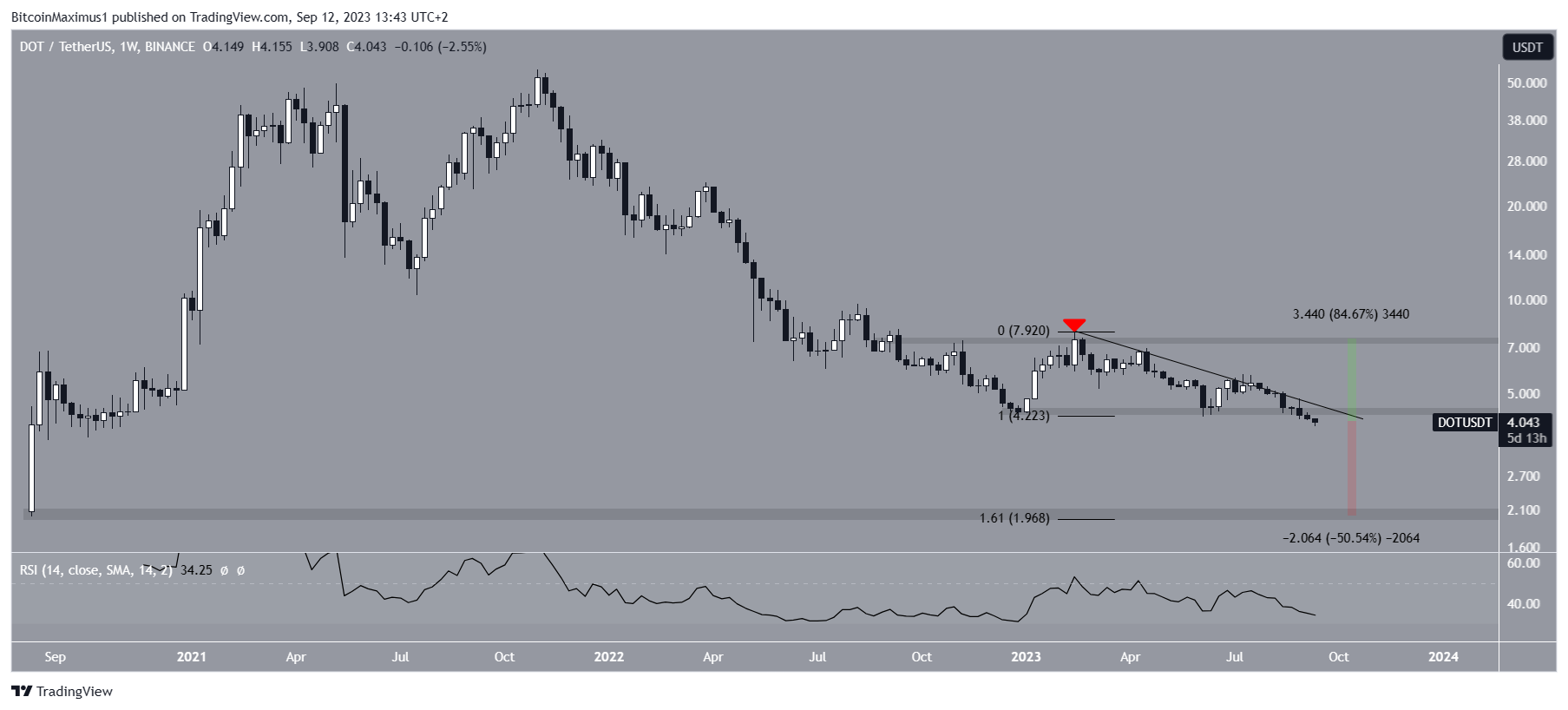 Phân tích kỹ thuật DOT theo khung thời gian hàng tuần cho thấy đồng coin này đã rơi xuống dưới đường kháng cự giảm dần kể từ mức cao hàng năm là 7.90 USD vào tháng 2/2023. Trong khi đi theo đường này, giá đã phá vỡ khỏi vùng hỗ trợ ngang 4.40 USD, vốn đã có từ đầu năm năm. Sự phá vỡ từ các mức hỗ trợ dài hạn như vậy thường gây ra sự sụt giảm đáng kể.