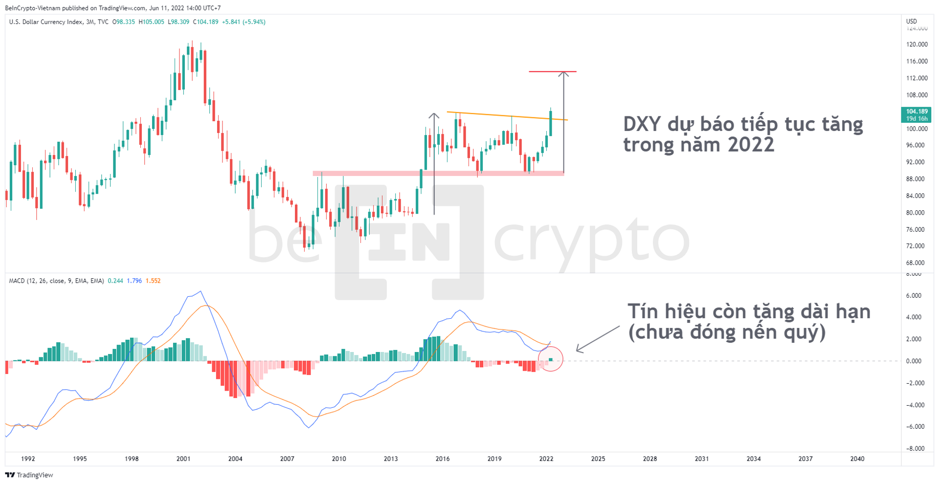 DXY tăng lên hơn 104 là đã vượt trendline kháng cự từ năm 2016 (đường màu vàng). Bằng cách sử dụng phương pháp đo giá của mô hình cờ tăng thì đà tăng này sẽ còn tiếp diễn trong năm 2022 và tăng ít nhất lên 114. Chỉ báo MACD-H đã bắt đầu chớm thanh histogram màu xanh đầu tiên. Nếu kết thúc quý 2 này DXY tiếp tục giữ trên 104 thì sẽ là tín hiệu cực xấu cho chứng khoán và Bitcoin.