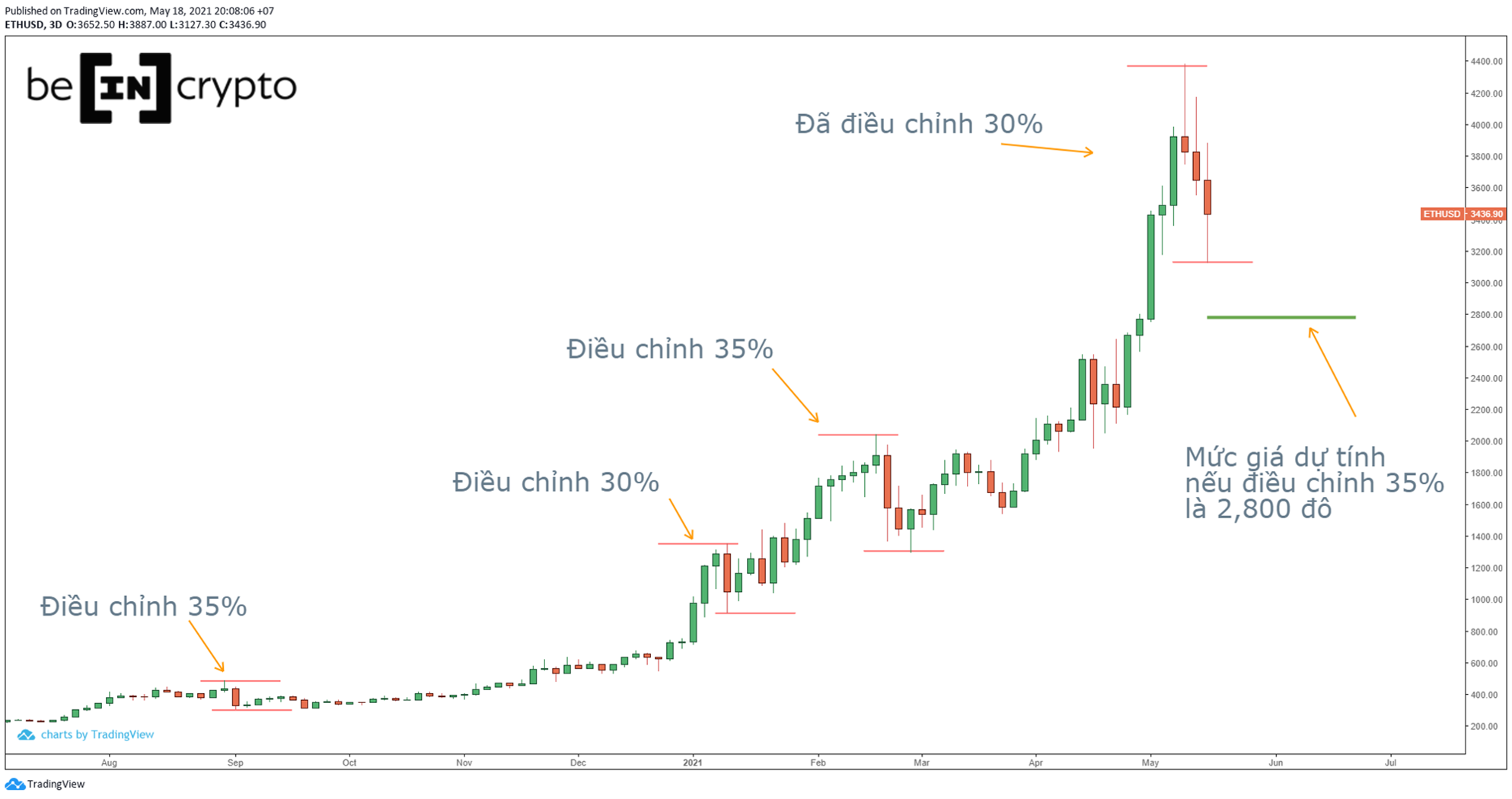 - Một lần nữa, mức 2,800 đô la lại được xác nhận. Cũng là mức tối đa 35% mỗi lần ETH điều chỉnh.
