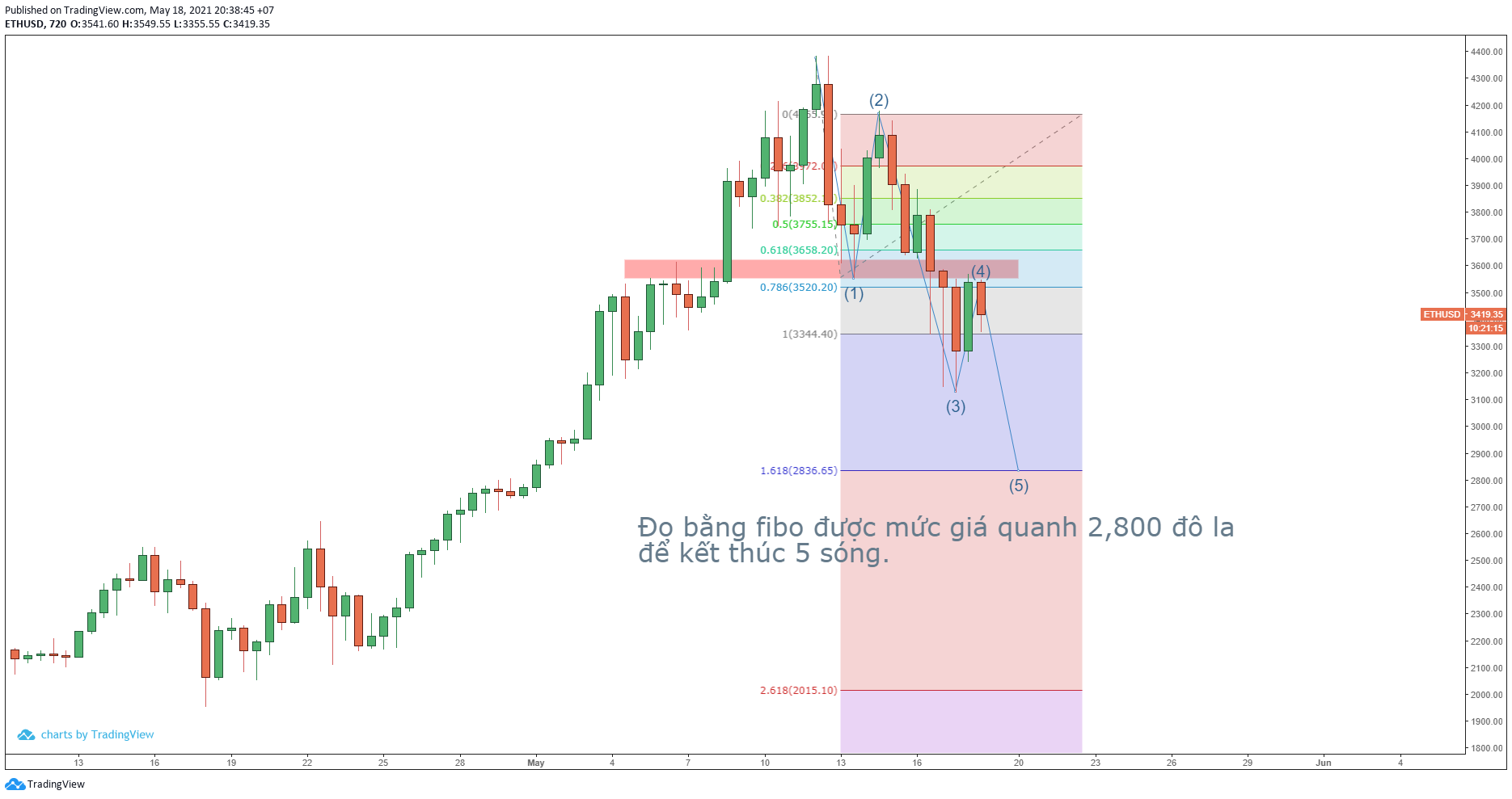 - Nếu đợt phục hồi thứ nhất kể từ đỉnh gần 4,400 đô la là sóng 2, thì đợt down vừa rồi là sóng 3, chúng ta còn một đợt (có thể là râu nến) nữa để đạt đến 5 sóng đầy đủ trong khung giờ nhỏ. Và đo đạc với Fibonacci mở rộng, thì tối đa của sóng 5 này có thể đạt đến quanh mức 2,800 đô la.