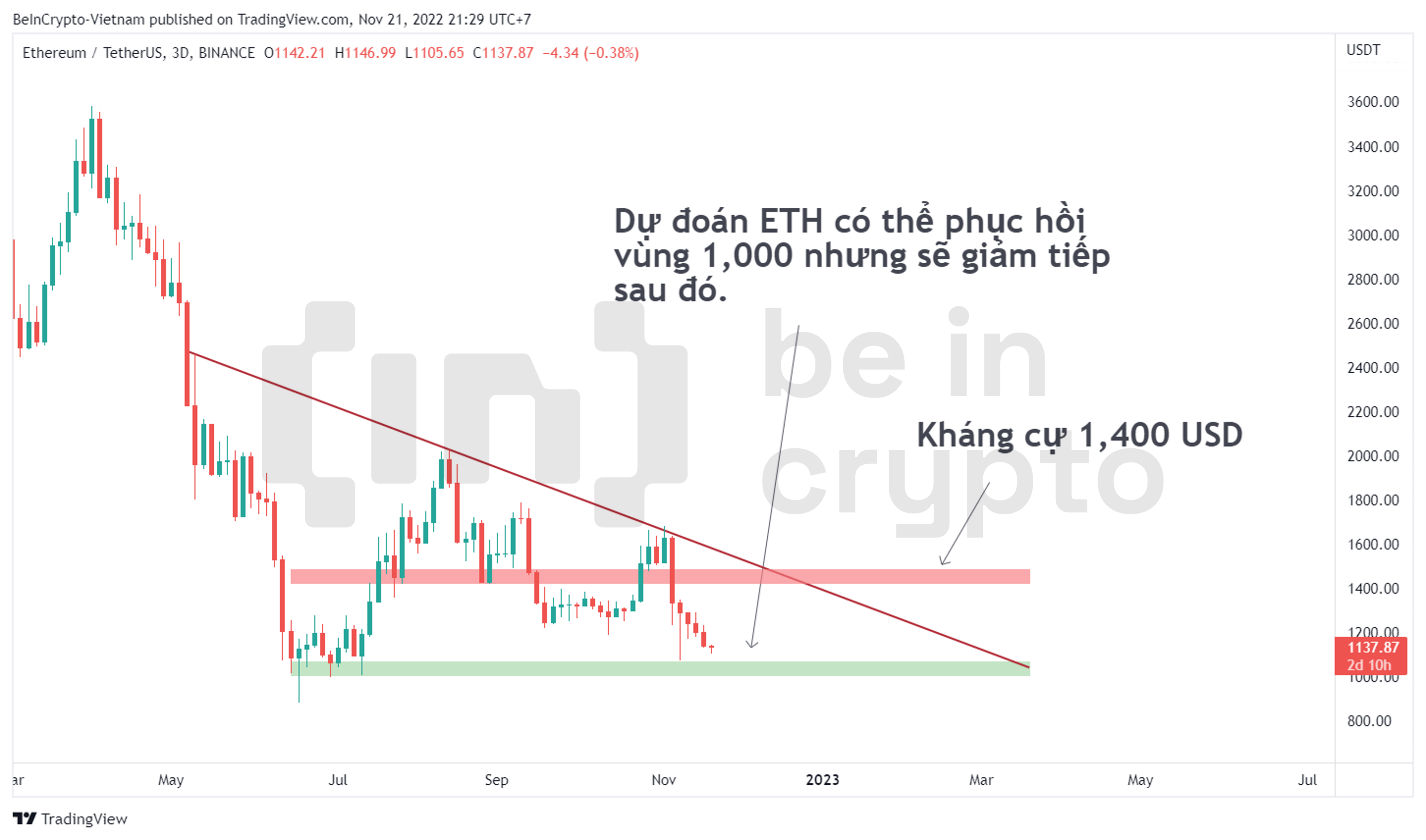 Giá Ethereum (ETH) tiếp tục bị vạ lây từ sự sụp đổ của sàn FTX. Dựa trên phân tích kỹ thuật ETH cho thấy khả năng giá trở về 3 con số đang rất gần.