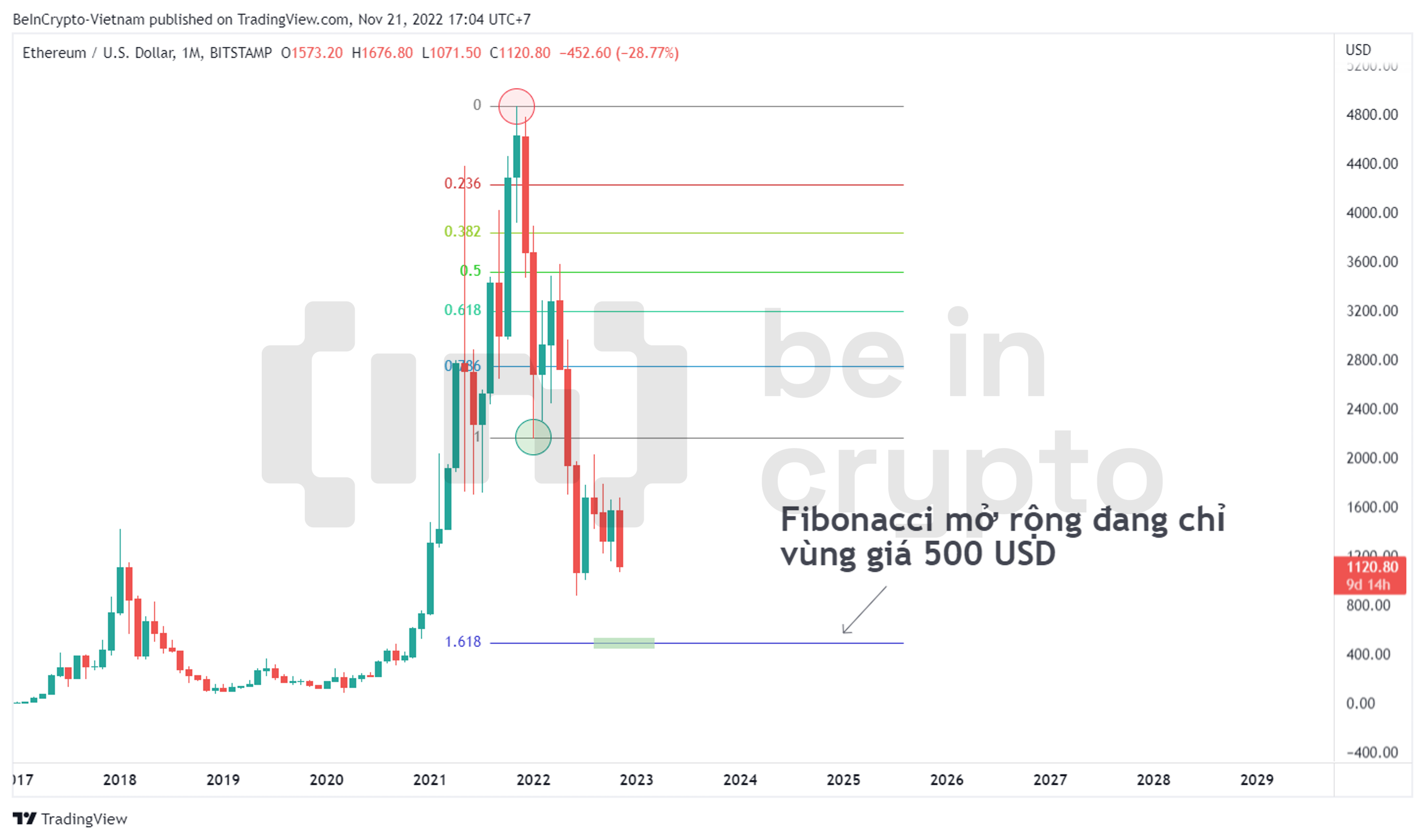 - Với phép đo giá bằng thước đo Fibonacci, nếu xem nhịp giảm lớn đầu tiên là từ 4,800 USD về 2,100 USD, thì phần mở rộng của Fibonacci cho đến mức tỷ lệ vàng 1.618 đang gợi ý kịch bản giá sẽ tiếp cận vùng 500 USD.