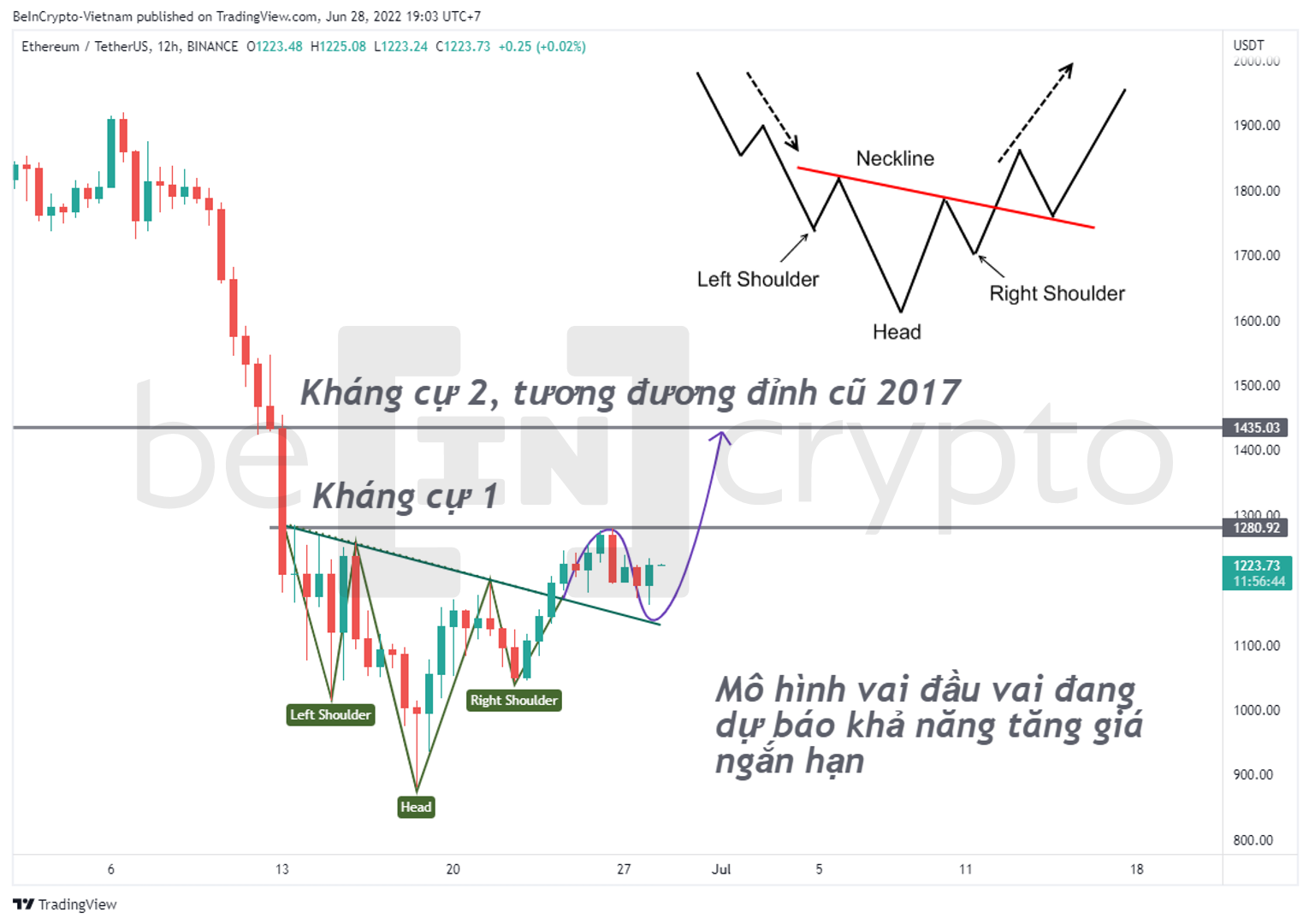 Mốc 1,435 USD chính là đỉnh cũ của năm 2018. Downtrend của ETH đã tạo một mức giá thấp hơn đỉnh của chu kỳ trước đó. Điều này tạo nên sự mất cân xứng cho siêu chu kỳ tăng trưởng lớn. Do đó, sự phục hồi trong dự đoán khung 12h như hình trên chỉ là ngắn hạn. Bạn có thể tham khảo phân tích kỹ thuật ETH dài hạn hơn tại bài viết này.