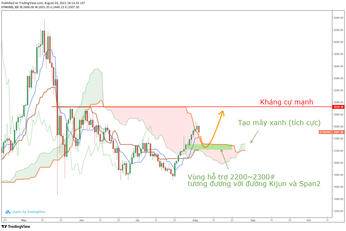 - Trước mắt, trong vài ngày tới ETH nếu có suy giảm thì giá tại vùng trung bình Kijun và Senko Span 2 (tức 2,200 ~ 2,300 đô) sẽ là vùng giá hỗ trợ đáng để giao dịch ngắn hạn. Đây cũng mà mức fibonacci 0.5 thường được xác traders sử dụng để đánh dấu mức thoái lui đáng tin cậy trước khi xu hướng hiện tại cứ tiếp diễn.