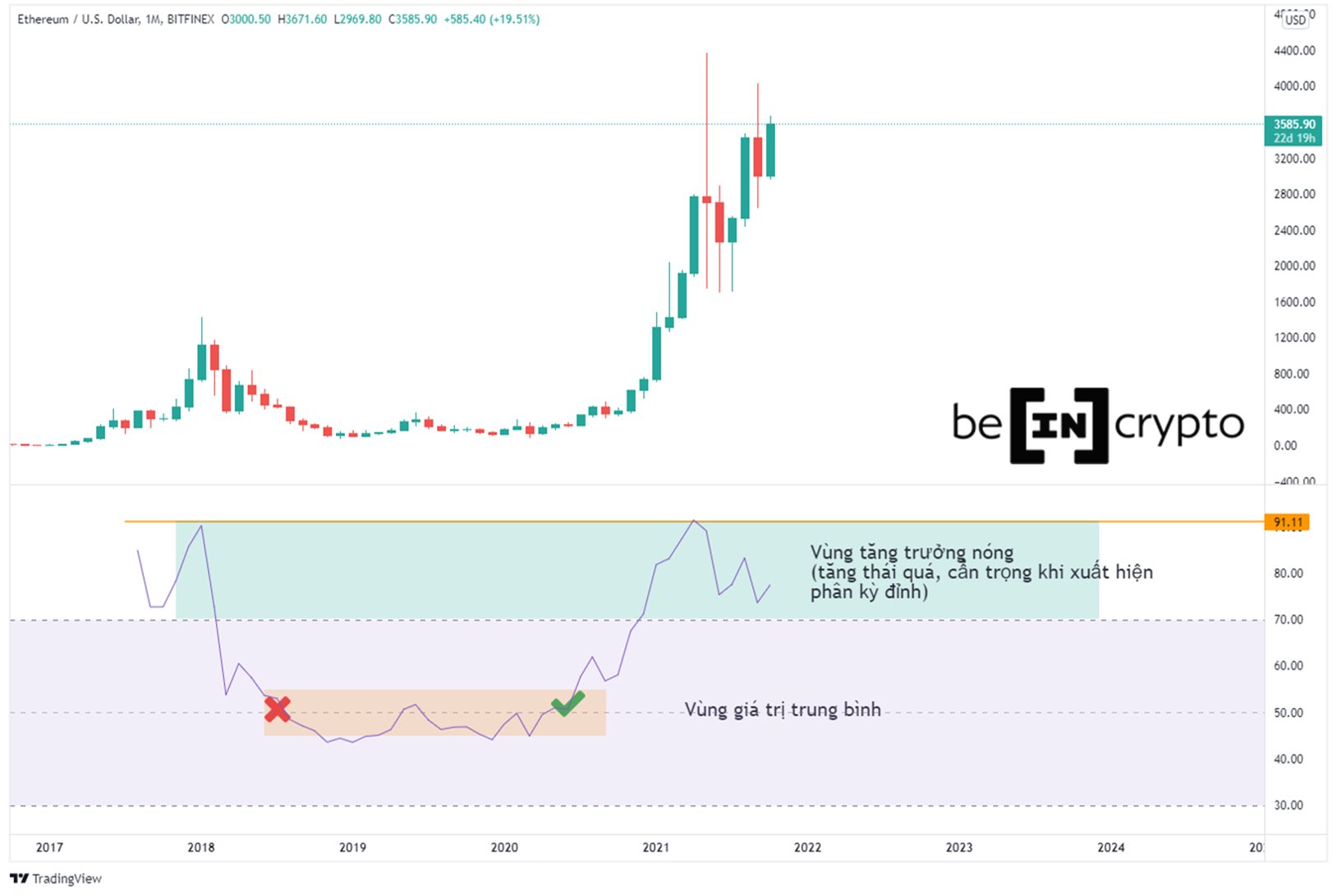 - Có thể thấy, toàn bộ quá trình tăng trưởng của ETH thì RSI tháng đa phần là trên 50. Khoảng thời gian “đen tối” nhất của ETH, RSI cũng chưa quá vùng 44. RSI được tính ra từ giá đóng cửa của nến. Cho nên, với cách biến động RSI như thế, có thể kết luận giá ETH luôn có những mức giá đóng cửa nến tháng cực tốt.
