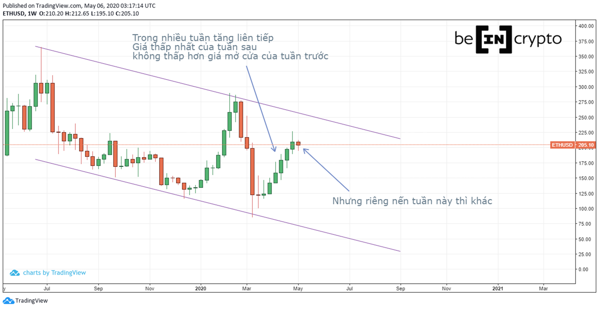 Trong nhiều tuần tăng liên tiếp, giá thấp của tuần sau không thể thấp hơn giá mở cửa của tuần trước. Nó có nghĩa, tạo ra cho chúng ta một dấu hiệu để cho thấy phe bò luôn thắng thế. Nhưng riêng tuần này thì khác hẳn, giá vẫn có thể tăng tiếp, nhưng điều đó không còn xuất hiện nữa.